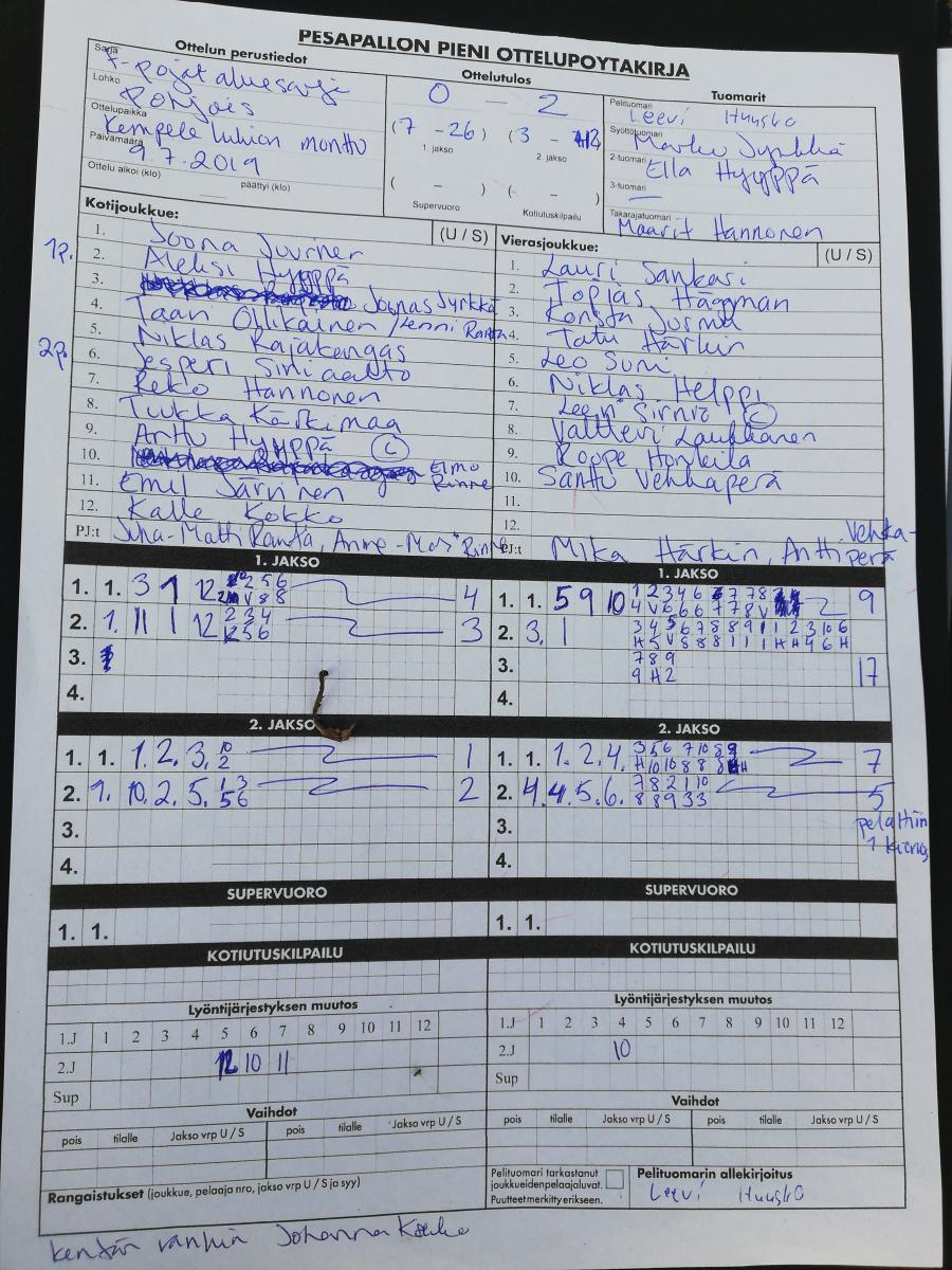 | 691804 | 29.6.2019 | KeKi | Haapajärvi | 0-2 (5-24, 2-18) | näytä |