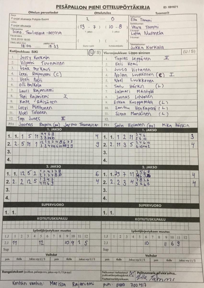 | 691671 | 19.6.2019 | SiKi | Lippo sininen | 2-0 (13-7, 10-8) | näytä |