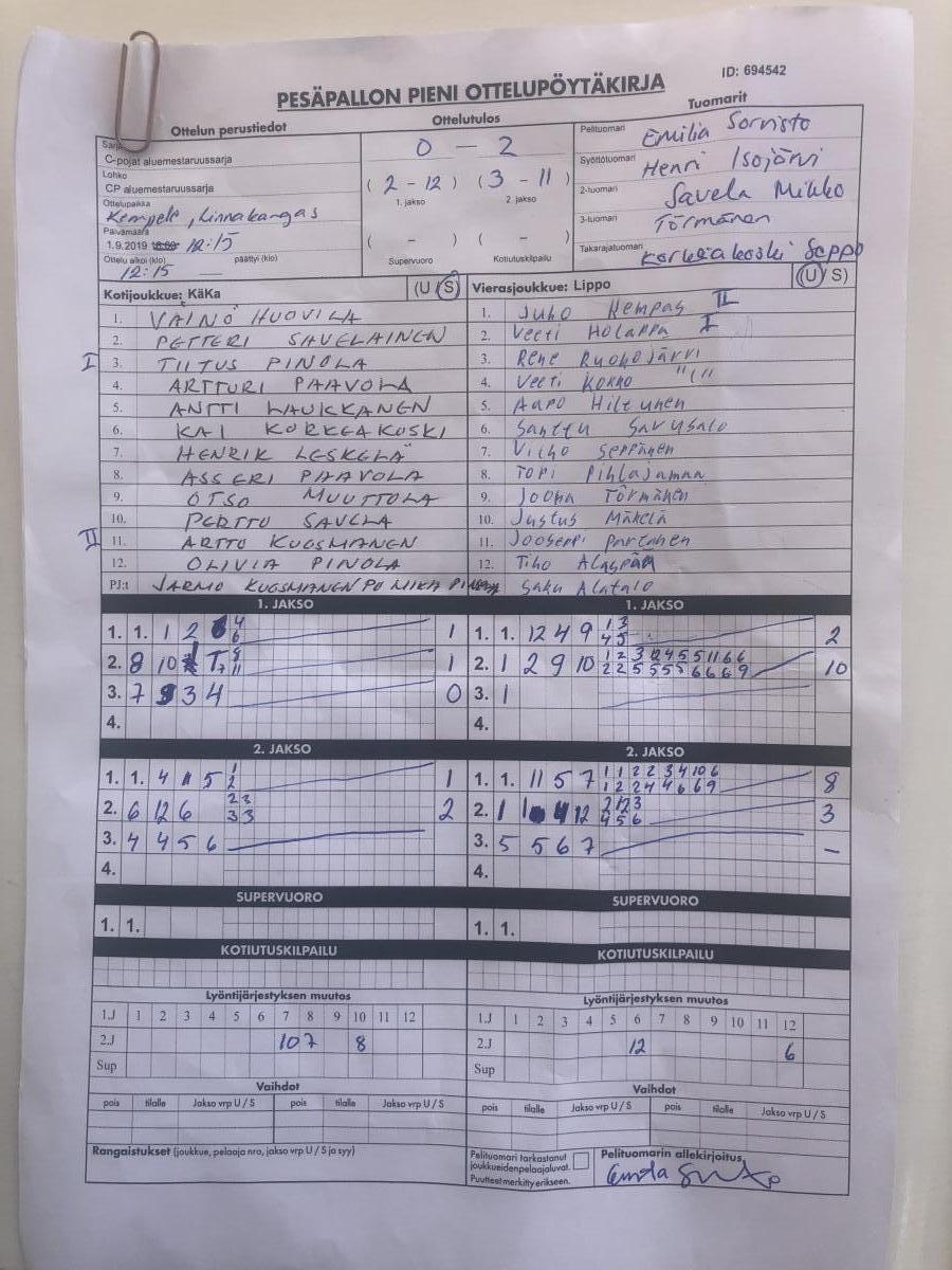 | 694542 | 1.9.2019 | KäKa | Lippo | 0-2 (2-12, 3-11) | näytä |