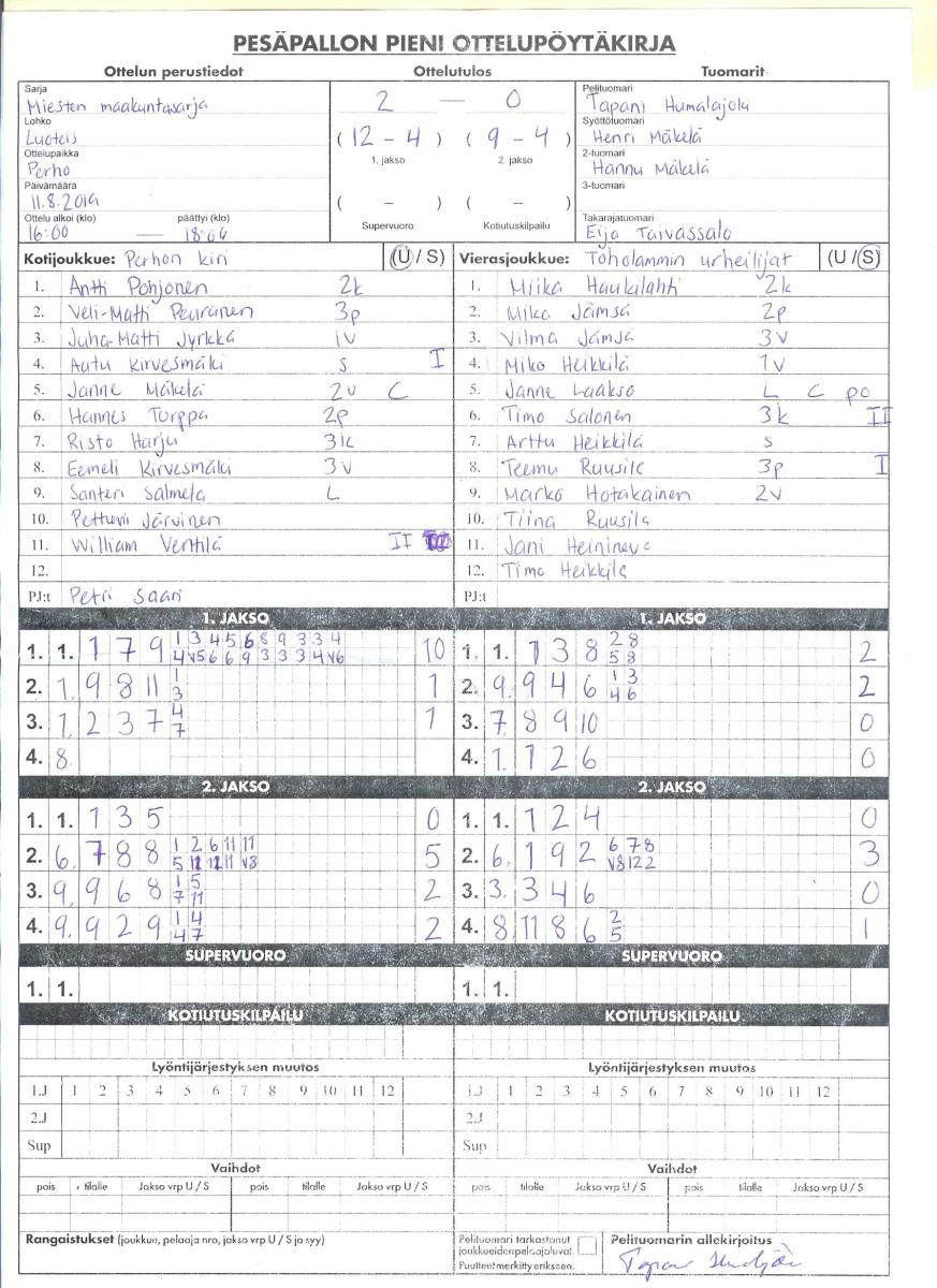| 675338 | 27.7.2019 | Perho | Toholampi | 2-0 (12-4, 9-4) | näytä |
