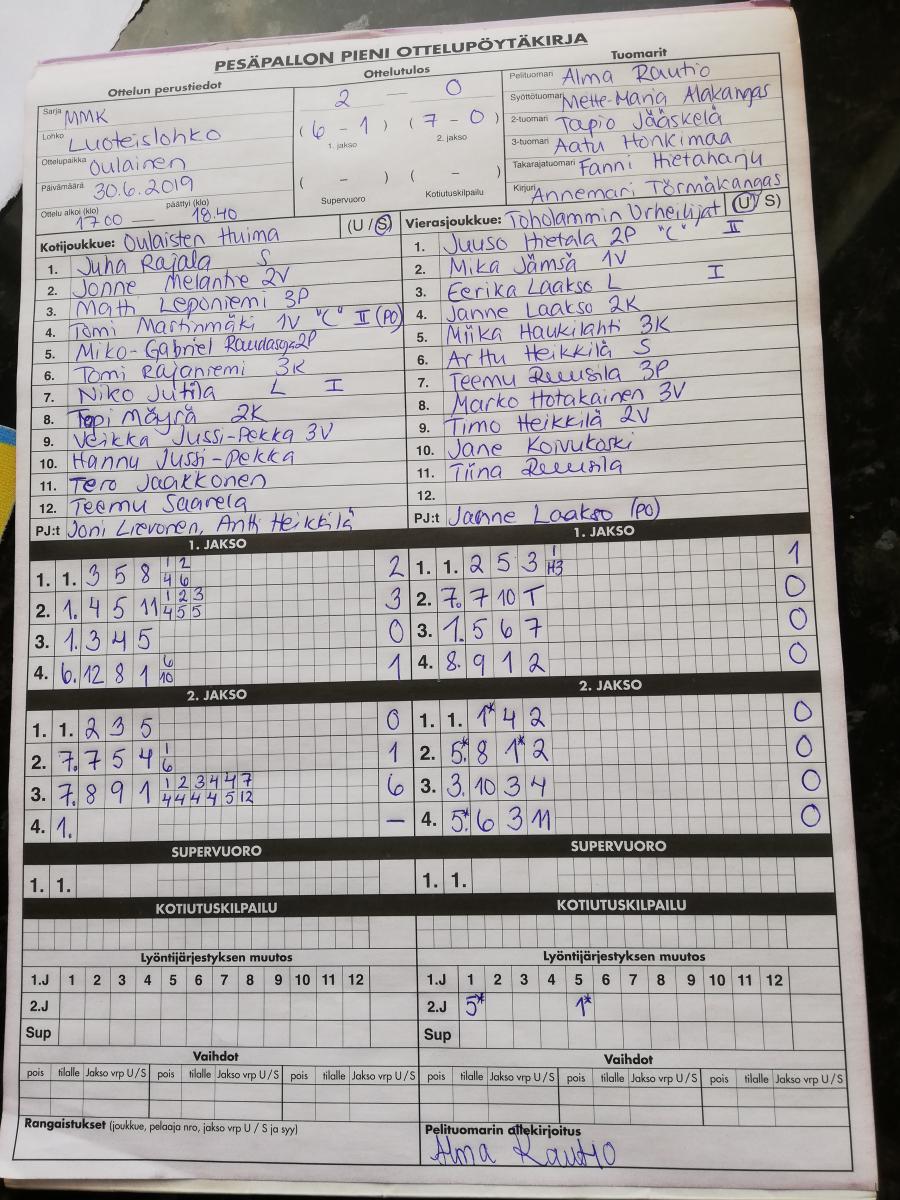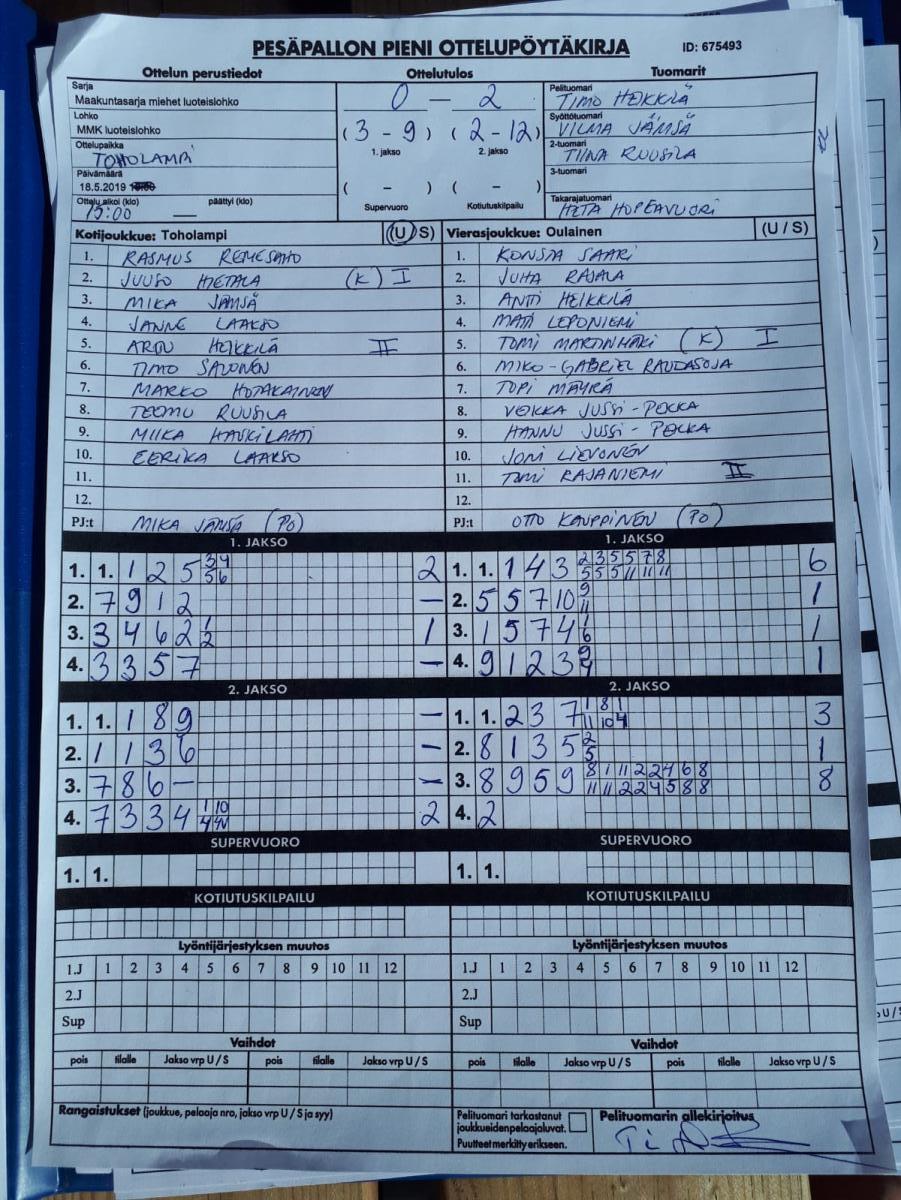 | 675493 | 18.5.2019 | Toholampi | Oulainen | 0-2 (3-9, 2-12) | näytä |