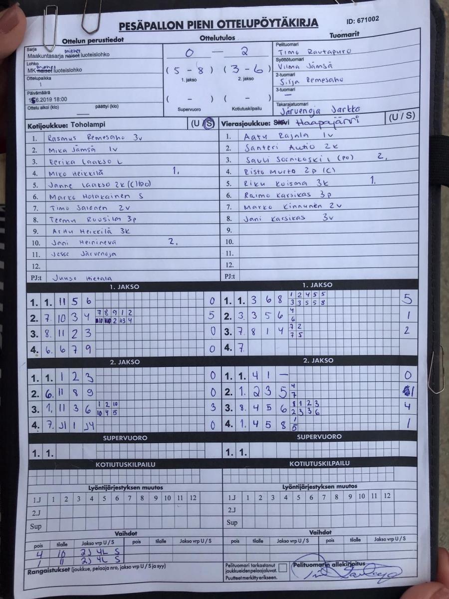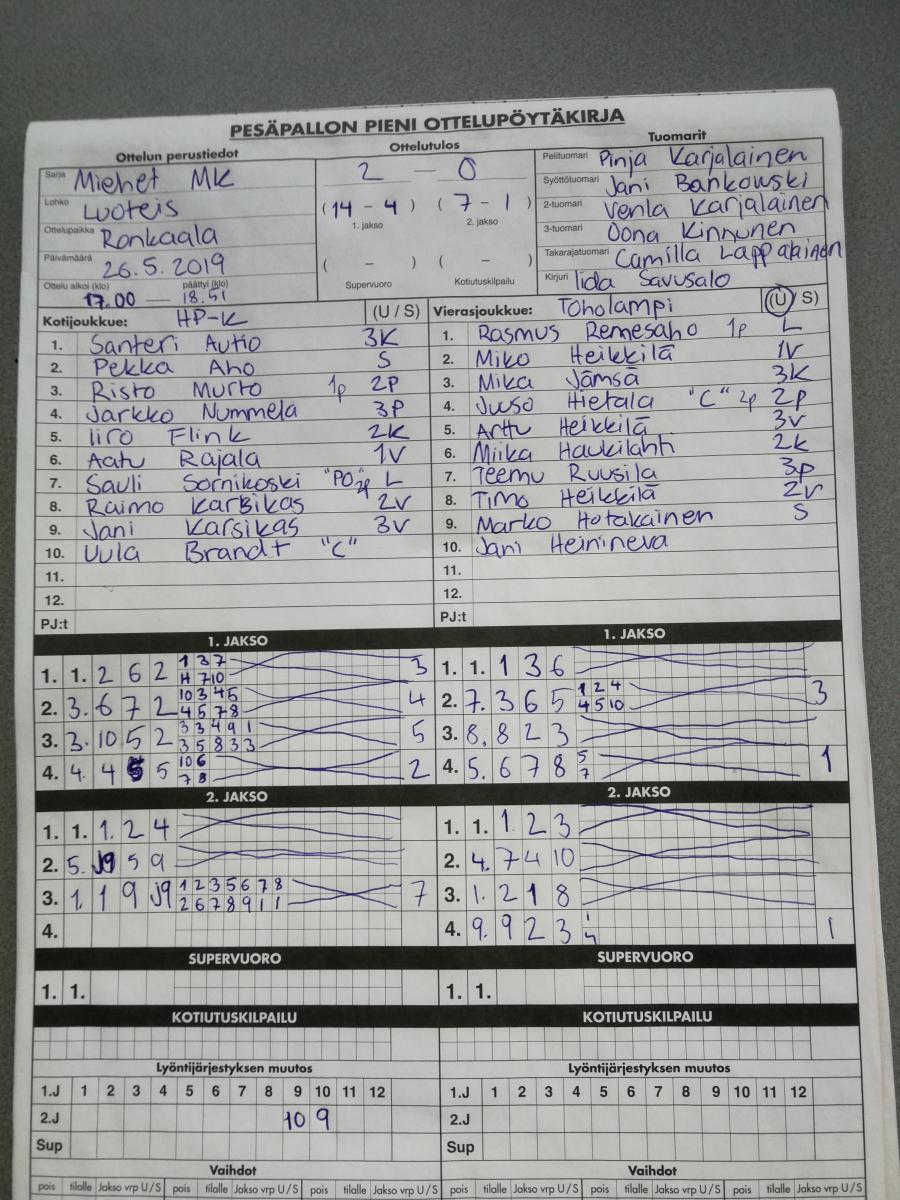 | 675529 | 26.5.2019 | Haapajärvi | Toholampi | 2-0 (13-4, 7-1) | näytä |