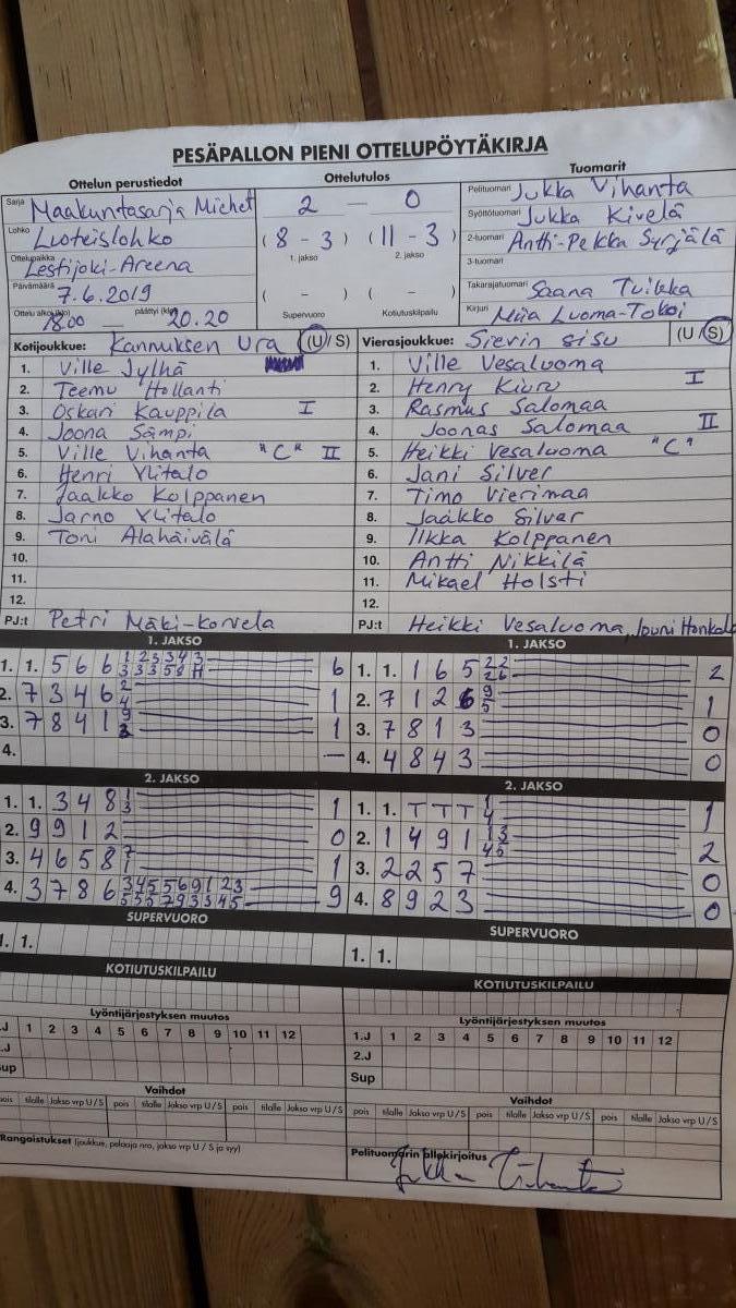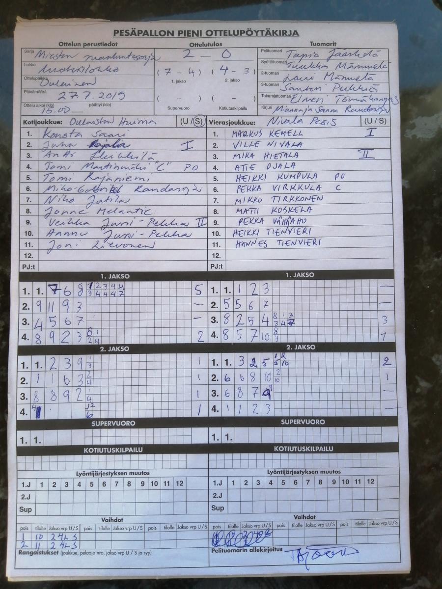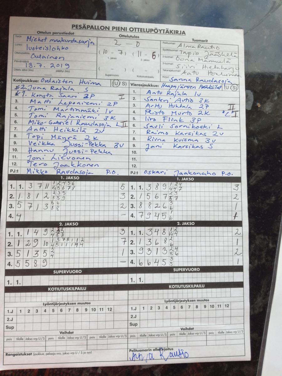 | 675590 | 13.7.2019 | Oulainen | Haapajärvi | 2-0 (10-7, 11-6) | näytä |