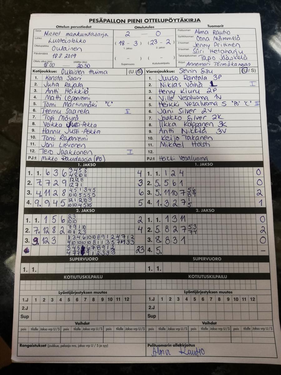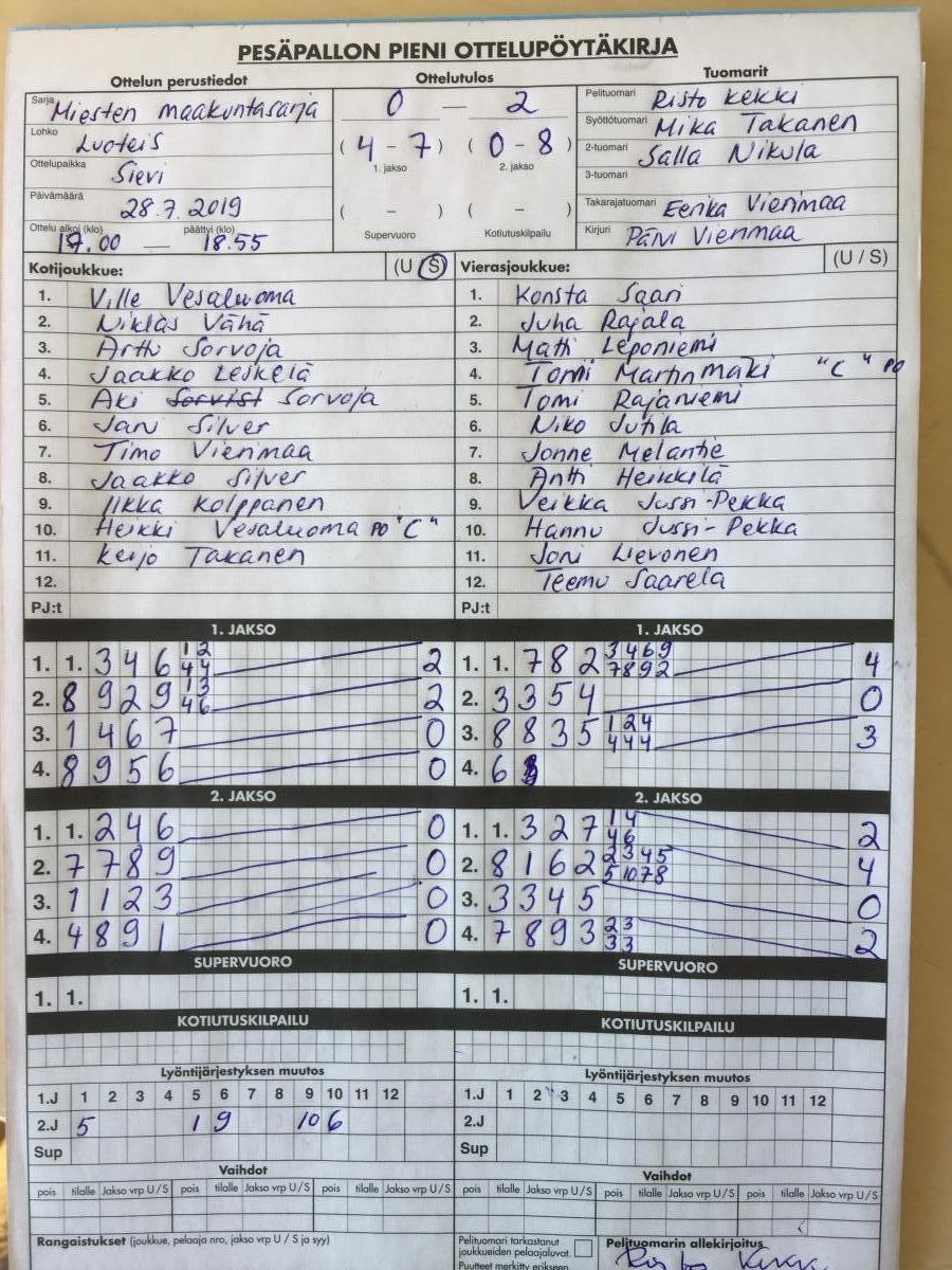 | 699055 | 28.7.2019 | Sievi | Oulainen | 0-2 (4-7, 0-8) | näytä |