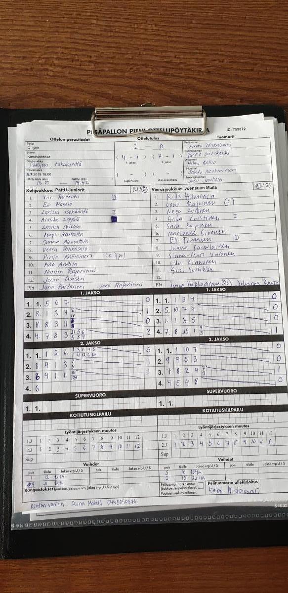 | 759872 | 8.7.2019 18:00 | PattU Juniorit | Joensuun Maila | 2-0 (4-1, 7-1) | näytä |