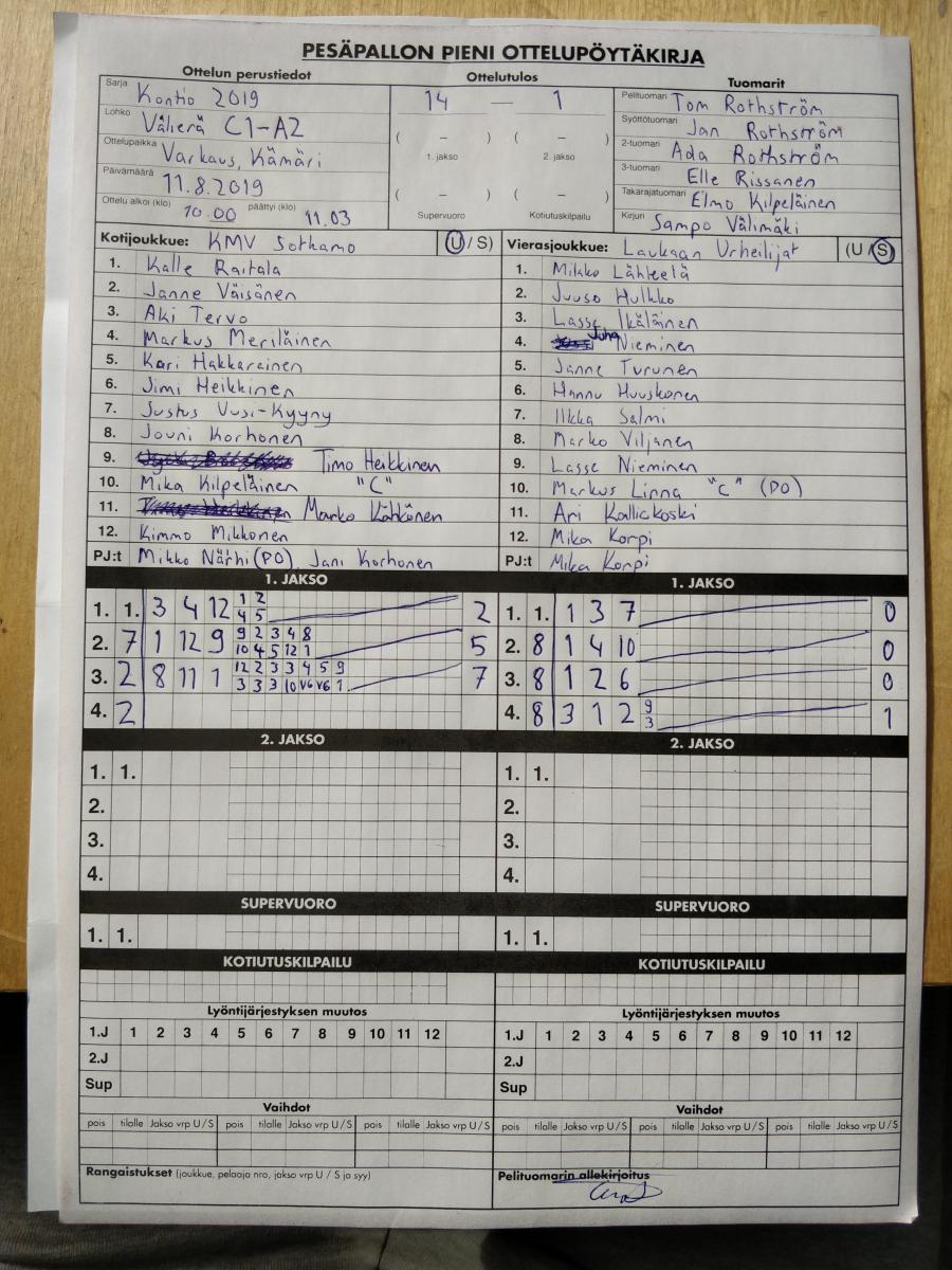 | 768245 | 11.8.2019 10:00 | Sotkamon Urheiluseura KMV | Laukaan Urheilijat | 14-1 | näytä |
