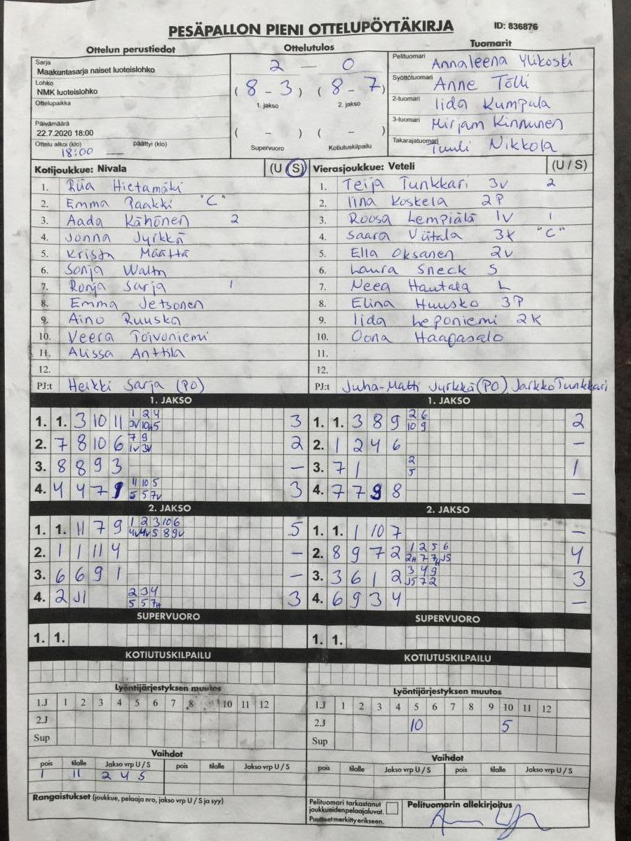 | 836876 | 22.7.2020 | Nivala | Veteli | 2-0 (8-3, 8-7) | näytä |