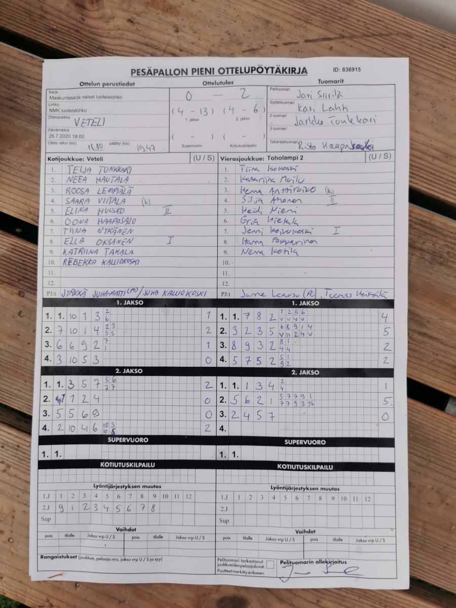 | 837037 | 24.6.2020 | Toholampi 1 | Veteli | 2-0 (19-1, 9-2) | näytä |