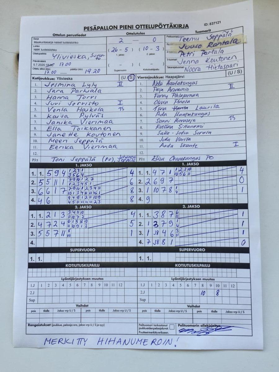 | 837121 | 5.7.2020 | Ylivieska | Haapajärvi | 2-0 (26-5, 10-3) | näytä |