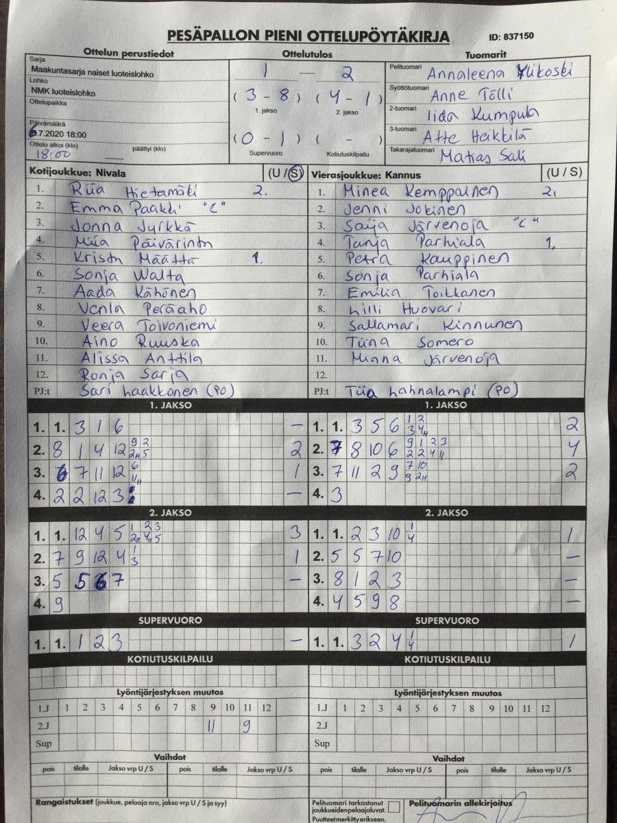 | 837150 | 8.7.2020 | Nivala | Kannus | 1-2 (3-8, 4-1, 0-1) | näytä |