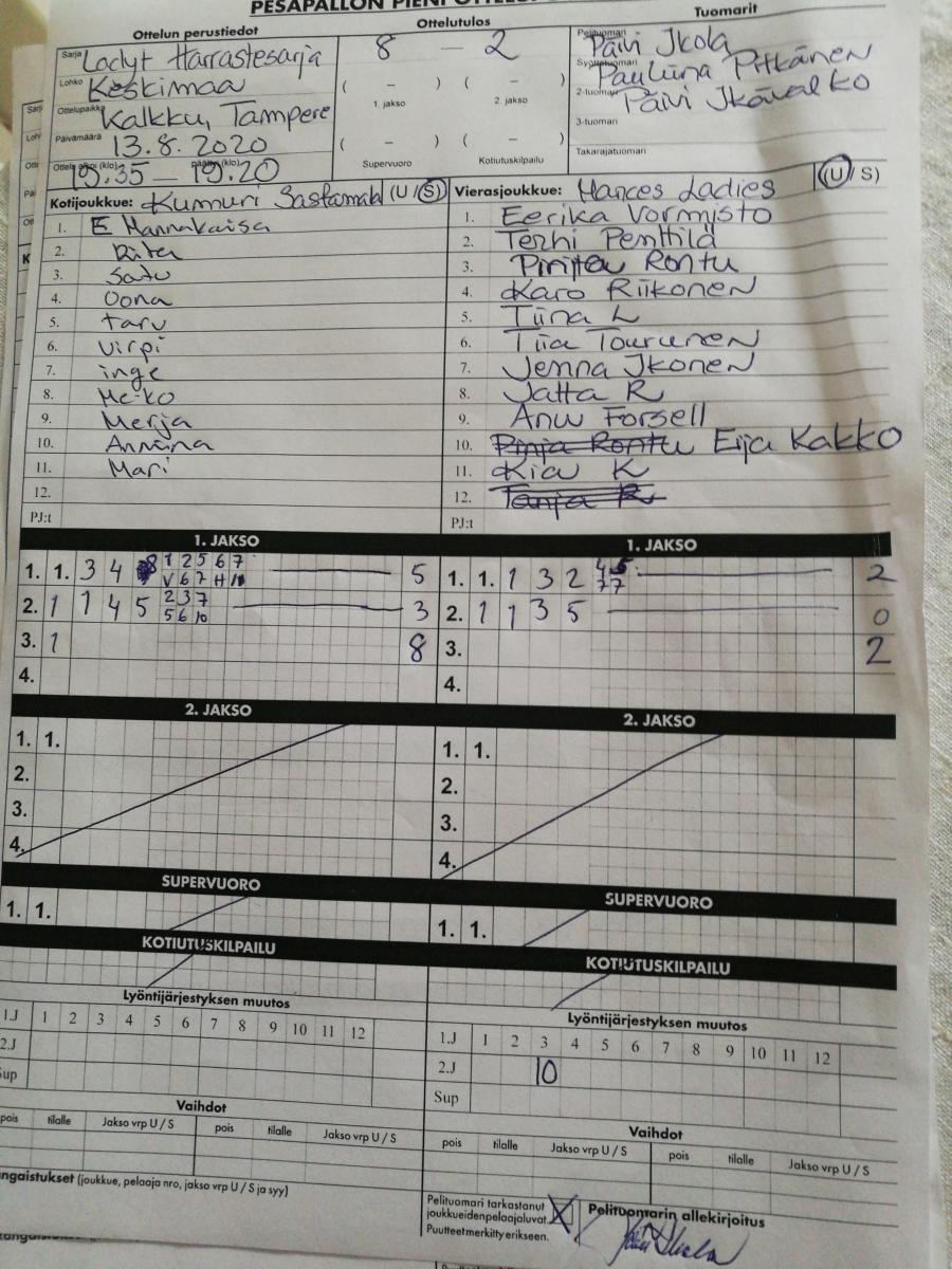 | 848961 | 12.7.2020 11:30 | Kumurin Ladyt | Lyöjättäret | 11-8 | näytä |