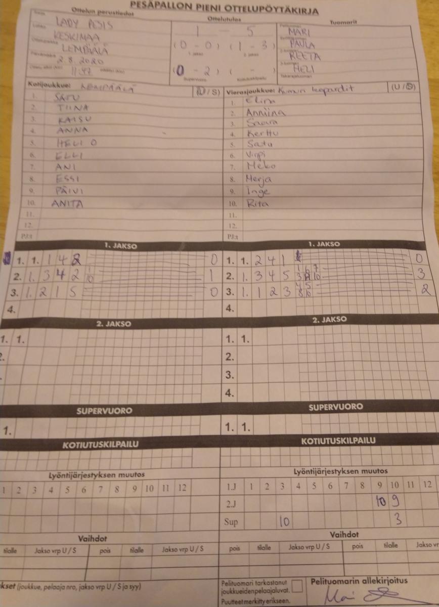 | 849038 | 2.8.2020 12:00 | Lyöjättäret | Kumurin Ladyt | 1-5 | näytä |