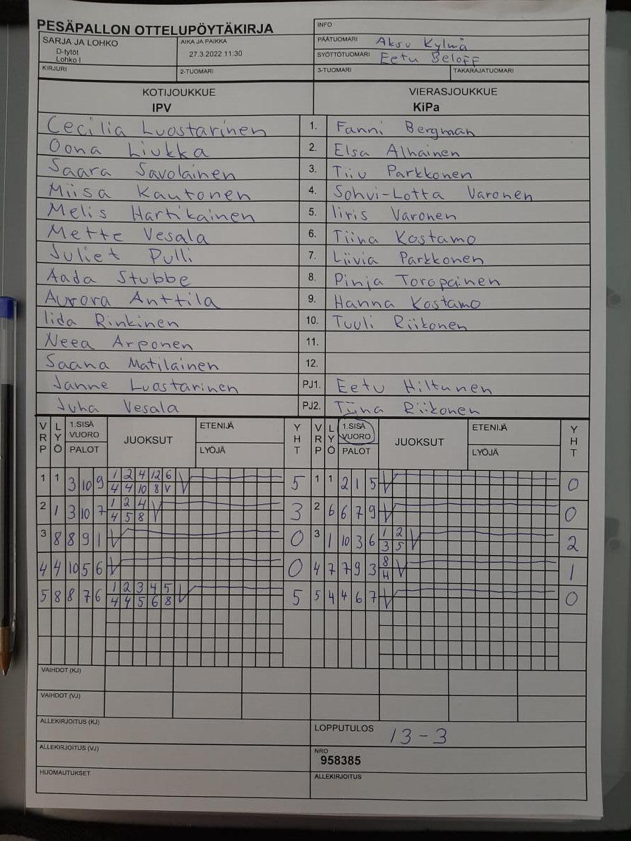 | 958385 | 27.3.2022 11:30 | IPV | KiPa | 13-3 | näytä |