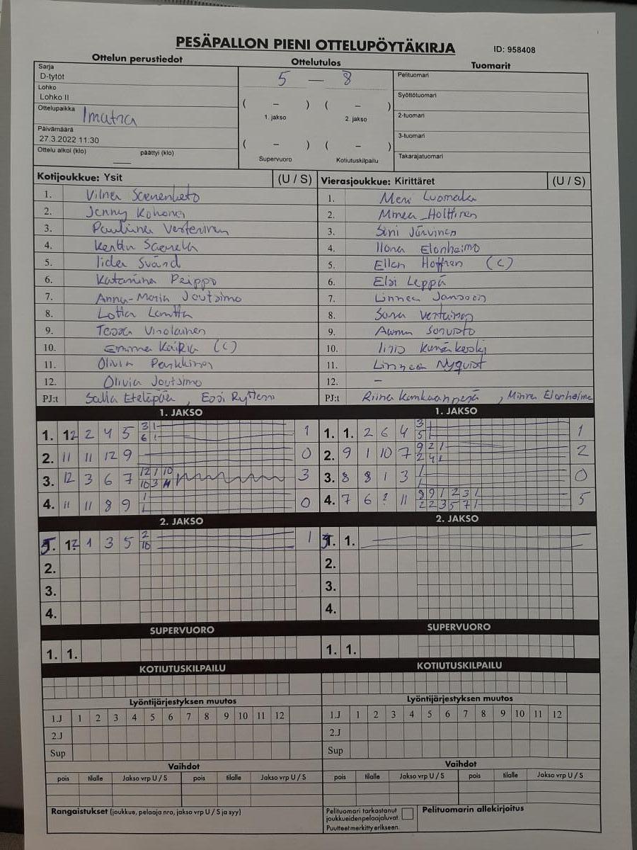 | 958408 | 27.3.2022 11:30 | Ysit | Kirittäret | 0-1 (5-8, 0-0) | näytä |