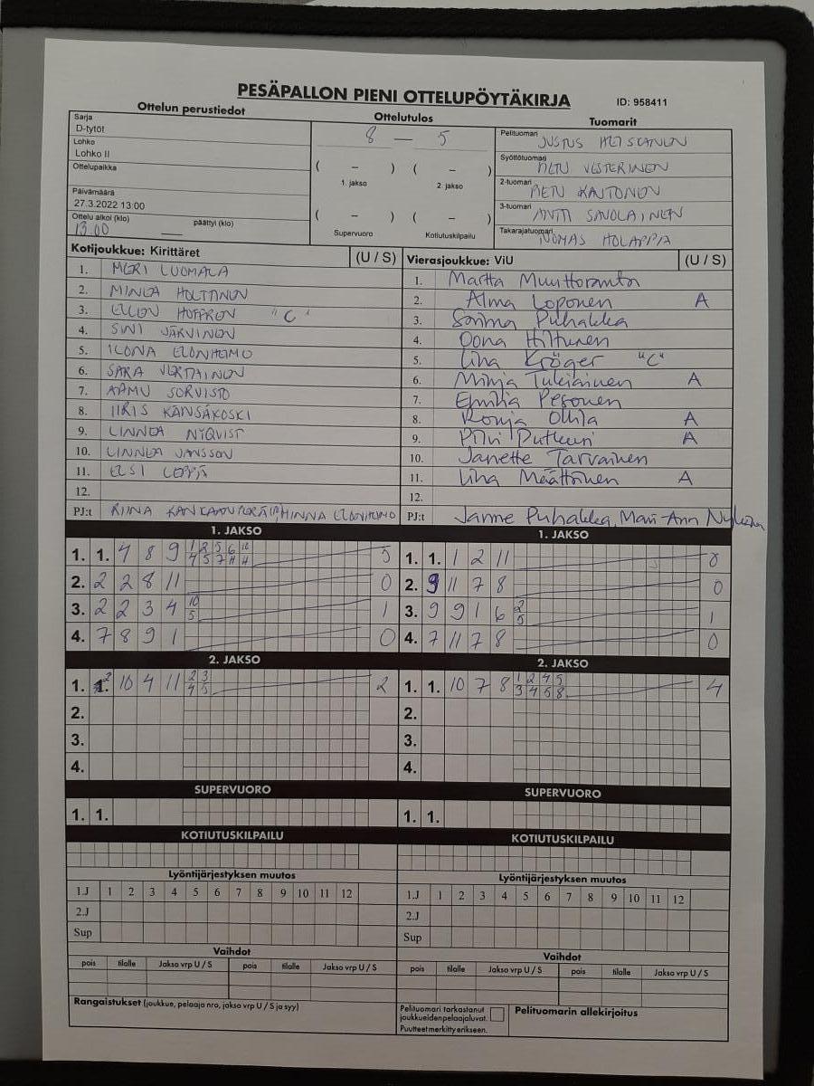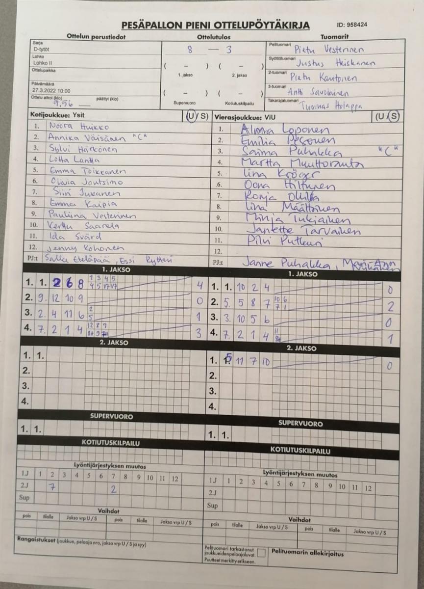 | 958411 | 27.3.2022 13:00 | Kirittäret | ViU | 1-0 (8-5, 0-0) | näytä |