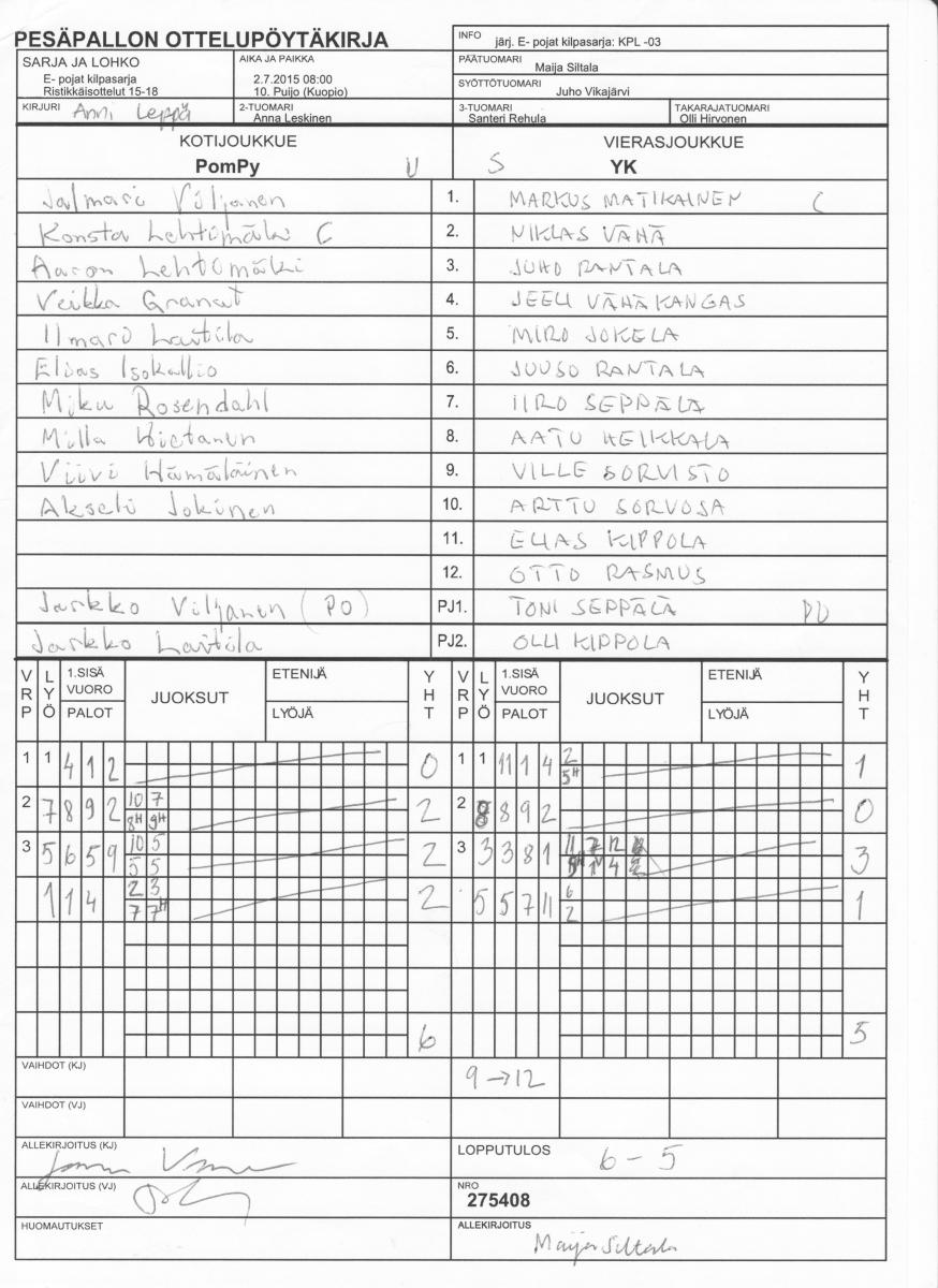 | 275408 | 2.7.2015 08:00 | 10. Puijo (Kuopio) | PomPy | YK | 6-5 | E- pojat kilpasarja: KPL -03 | näytä |