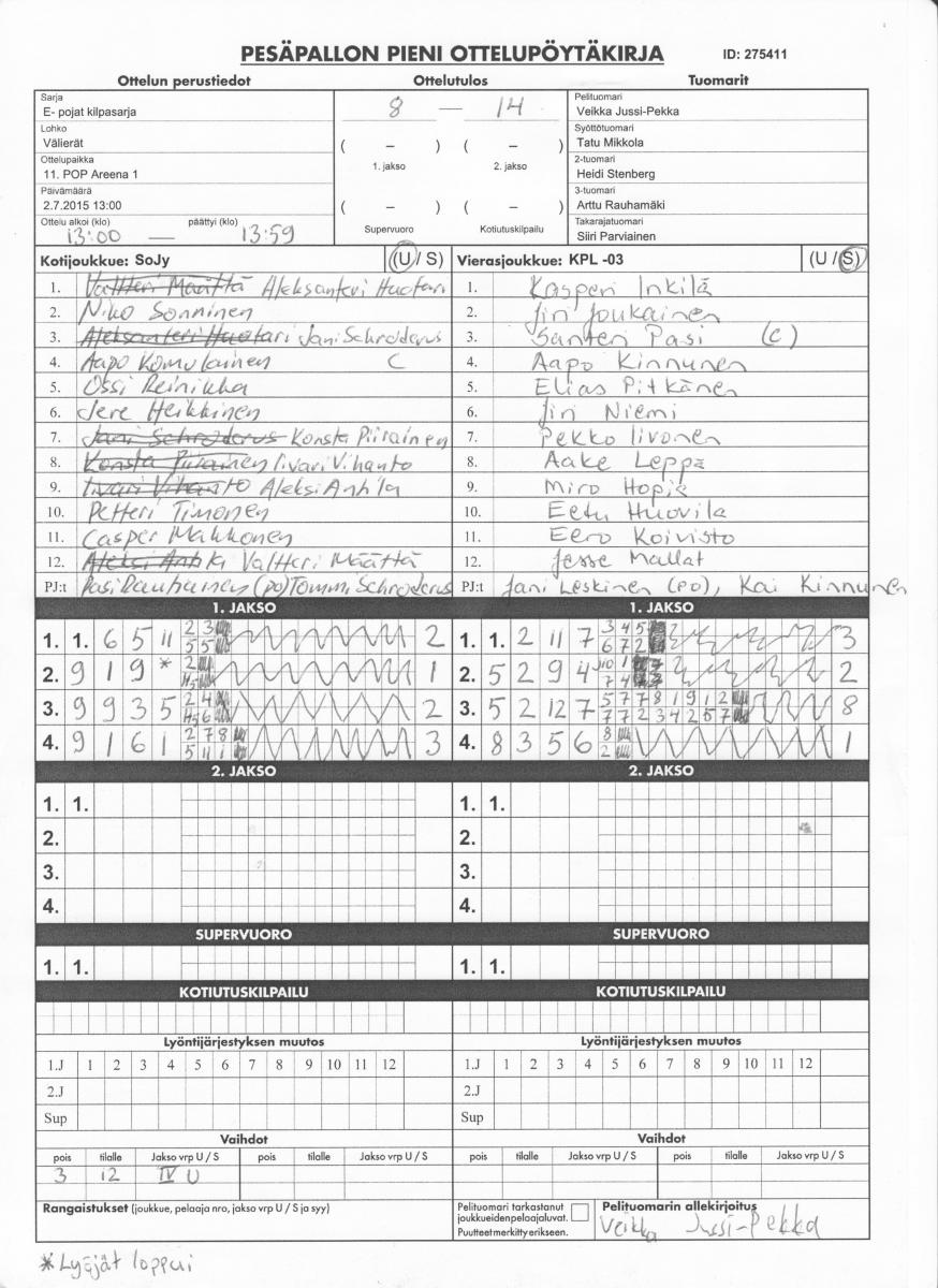 | 275411 | 2.7.2015 13:00 | 11. POP Areena 1 | SoJy | KPL -03 | 8-14 | näytä |