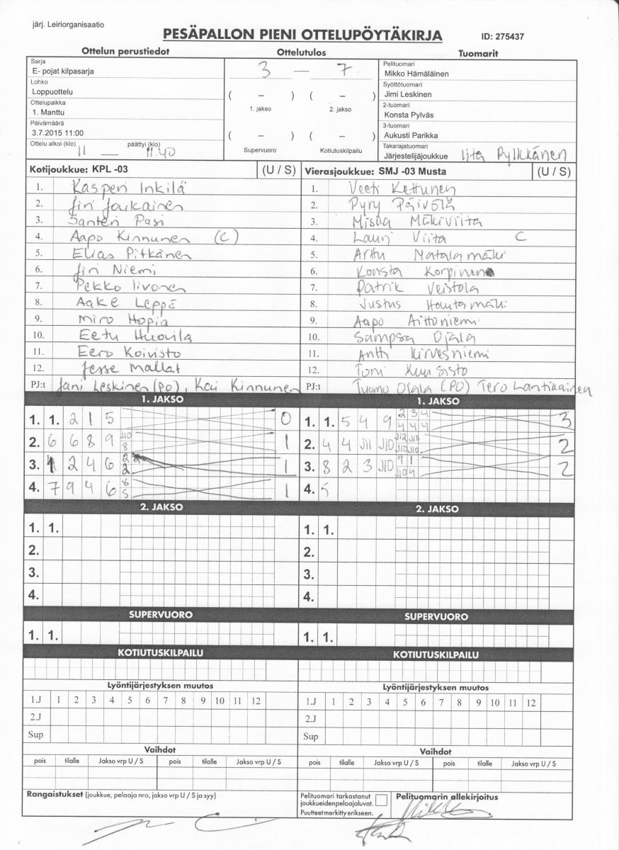 | 275437 | 3.7.2015 11:00 | 1. Manttu | KPL -03 | SMJ -03 Musta | 3-7 | Leiriorganisaatio | näytä |