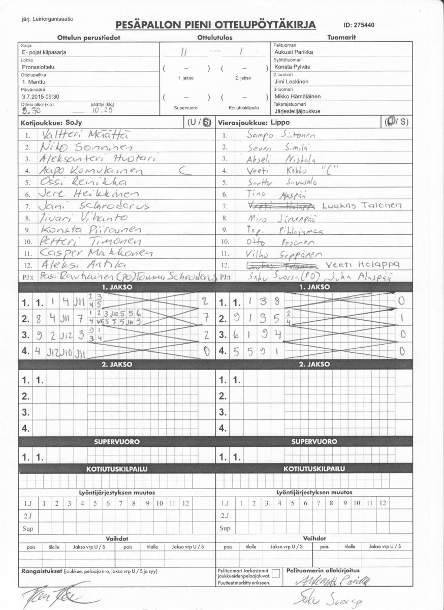 | 275440 | 3.7.2015 09:30 | 1. Manttu | SoJy | Lippo | 11-1 | Leiriorganisaatio | näytä |