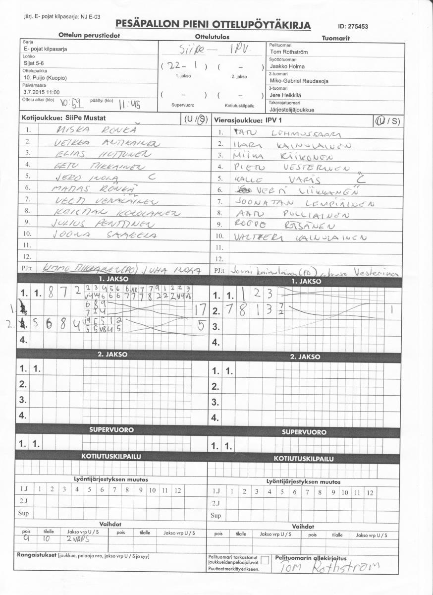| 275453 | 3.7.2015 11:00 | 10. Puijo (Kuopio) | SiiPe Mustat | IPV 1 | 22-1 | E- pojat kilpasarja: NJ E-03 | näytä |