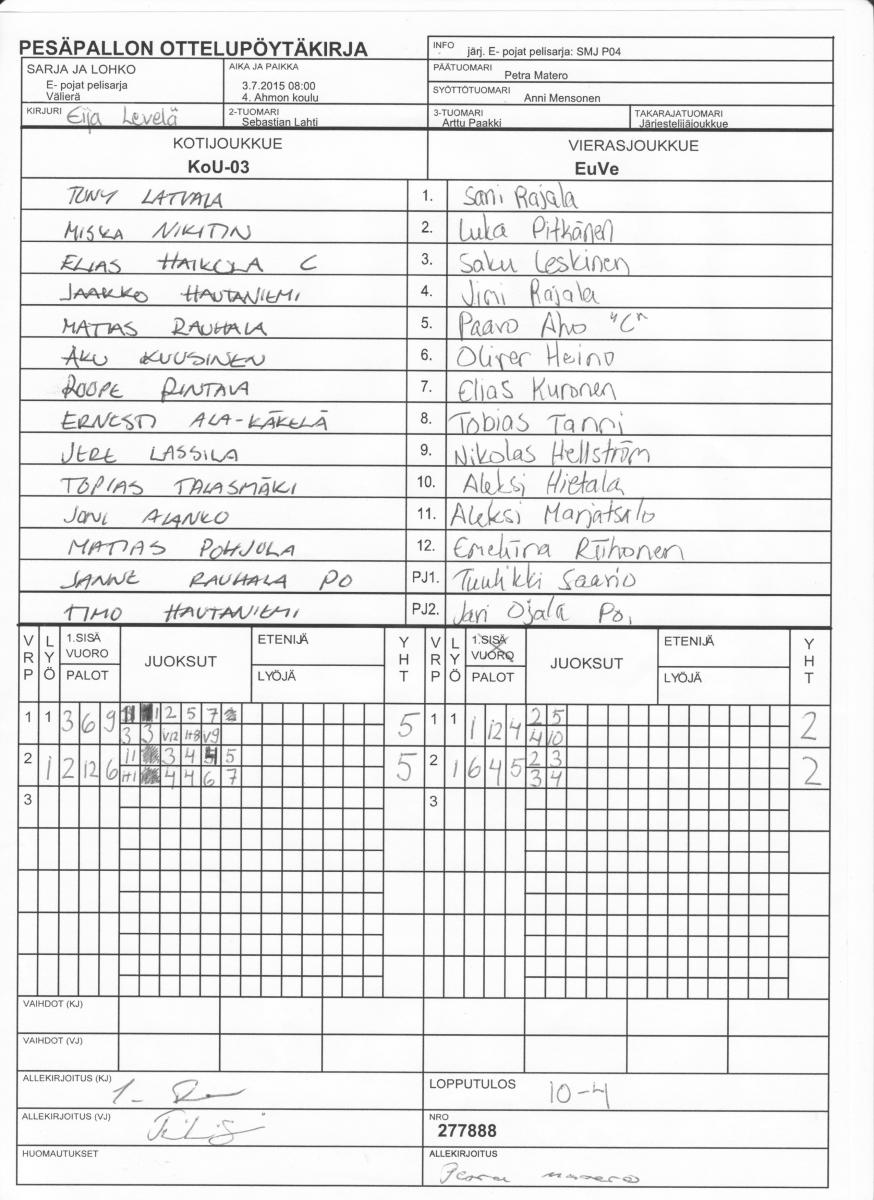 | 277888 | 3.7.2015 08:00 | 4. Ahmon koulu | KoU-03 | EuVe | 10-4 | E- pojat pelisarja: SMJ P04 | näytä |