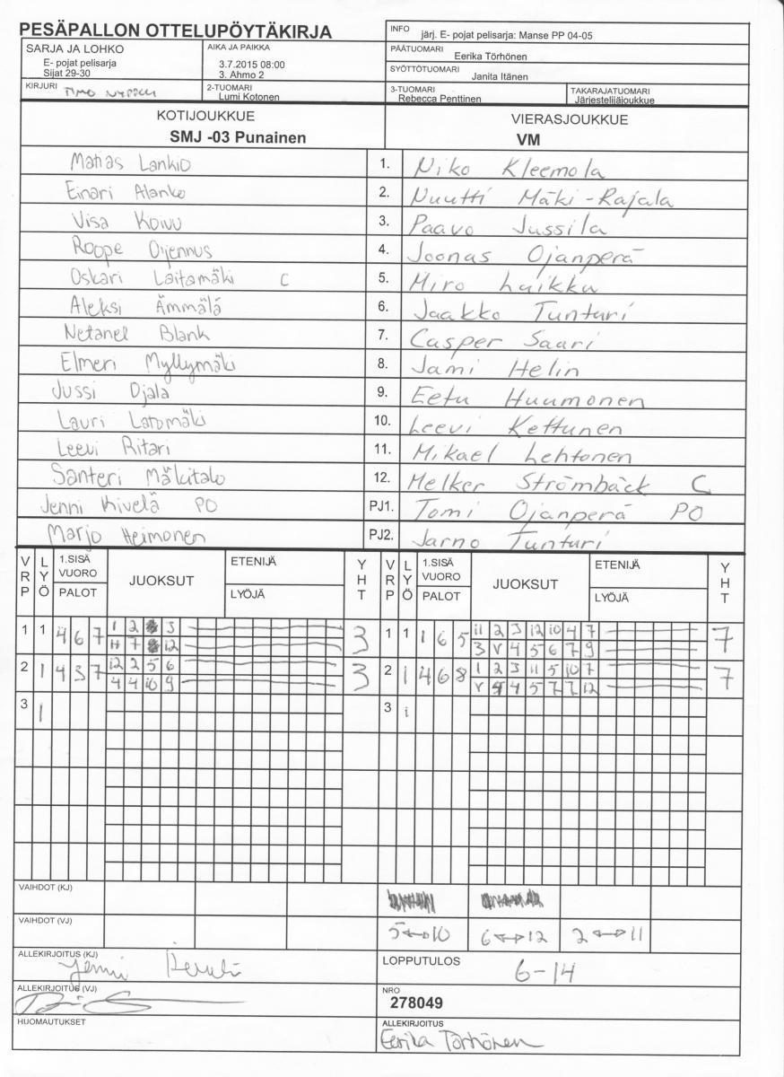 | 278049 | 3.7.2015 08:00 | 3. Ahmo 2 | SMJ -03 Punainen | VM | 6-14 | E- pojat pelisarja: Manse PP 04-05 | näytä |