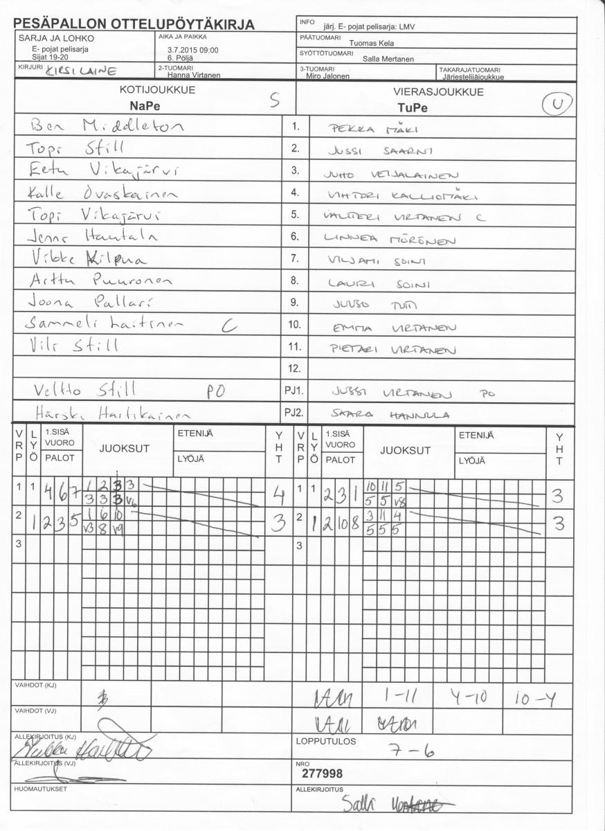 | 277998 | 3.7.2015 09:00 | 6. Pöljä | NaPe | TuPe | 7-6 | E- pojat pelisarja: LMV | näytä |