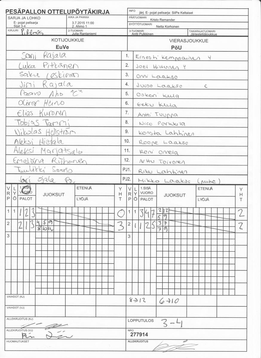 | 277914 | 3.7.2015 11:00 | 2. Ahmo 1 | EuVe | PöU | 3-4 | E- pojat pelisarja: SiiPe Keltaiset | näytä |
