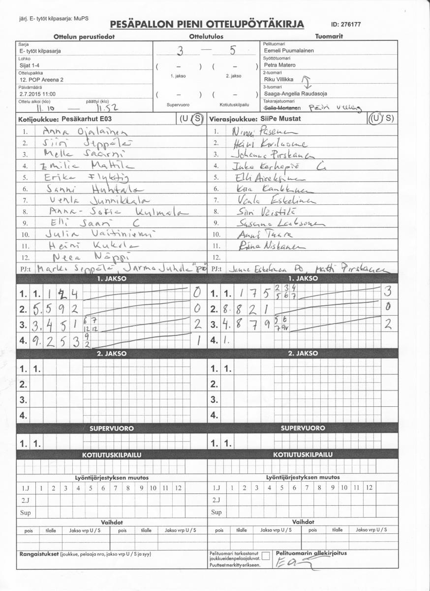 | 276177 | 2.7.2015 11:00 | 12. POP Areena 2 | Pesäkarhut E03 | SiiPe Mustat | 3-5 | E- tytöt kilpasarja: MuPS | näytä |