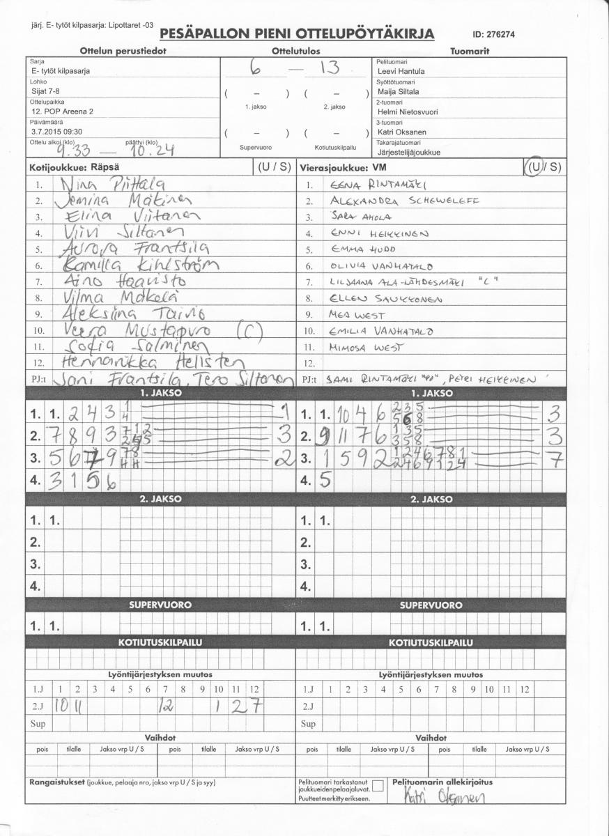 | 276274 | 3.7.2015 09:30 | 12. POP Areena 2 | Räpsä | VM | 6-13 | E- tytöt kilpasarja: Lipottaret -03 | näytä |