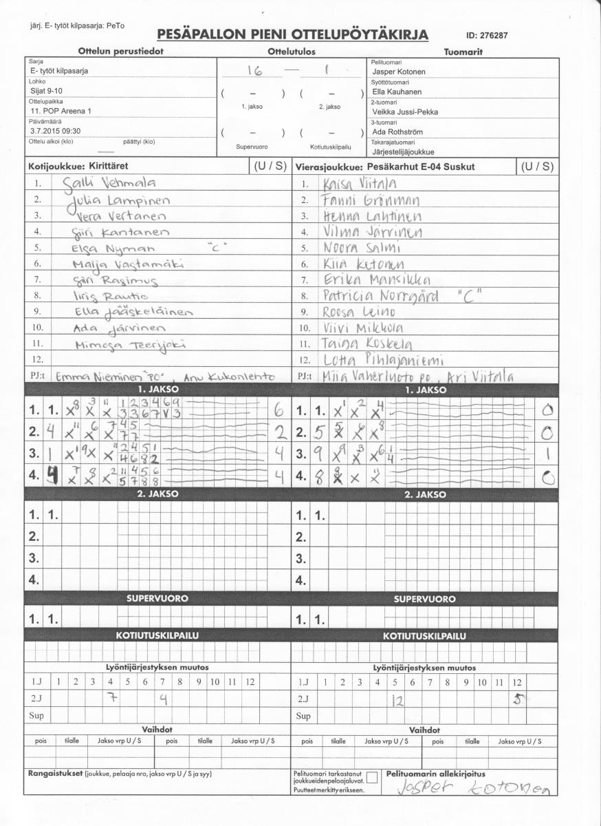 | 276287 | 3.7.2015 09:30 | 11. POP Areena 1 | Kirittäret | Pesäkarhut E-04 Suskut | 16-1 | E- tytöt kilpasarja: PeTo | näytä |