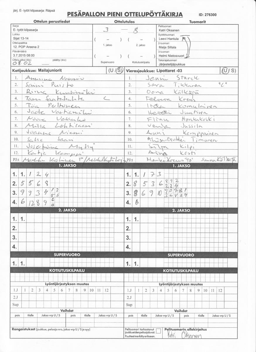 | 276300 | 3.7.2015 08:00 | 12. POP Areena 2 | Mailajuniorit | Lipottaret -03 | 3-8 | E- tytöt kilpasarja: Räpsä | näytä |