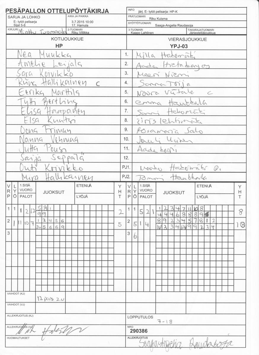 | 290386 | 3.7.2015 10:00 | 17. Hamula | HP | YPJ-03 | 7-18 | E- tytöt pelisarja: HP-K | näytä |
