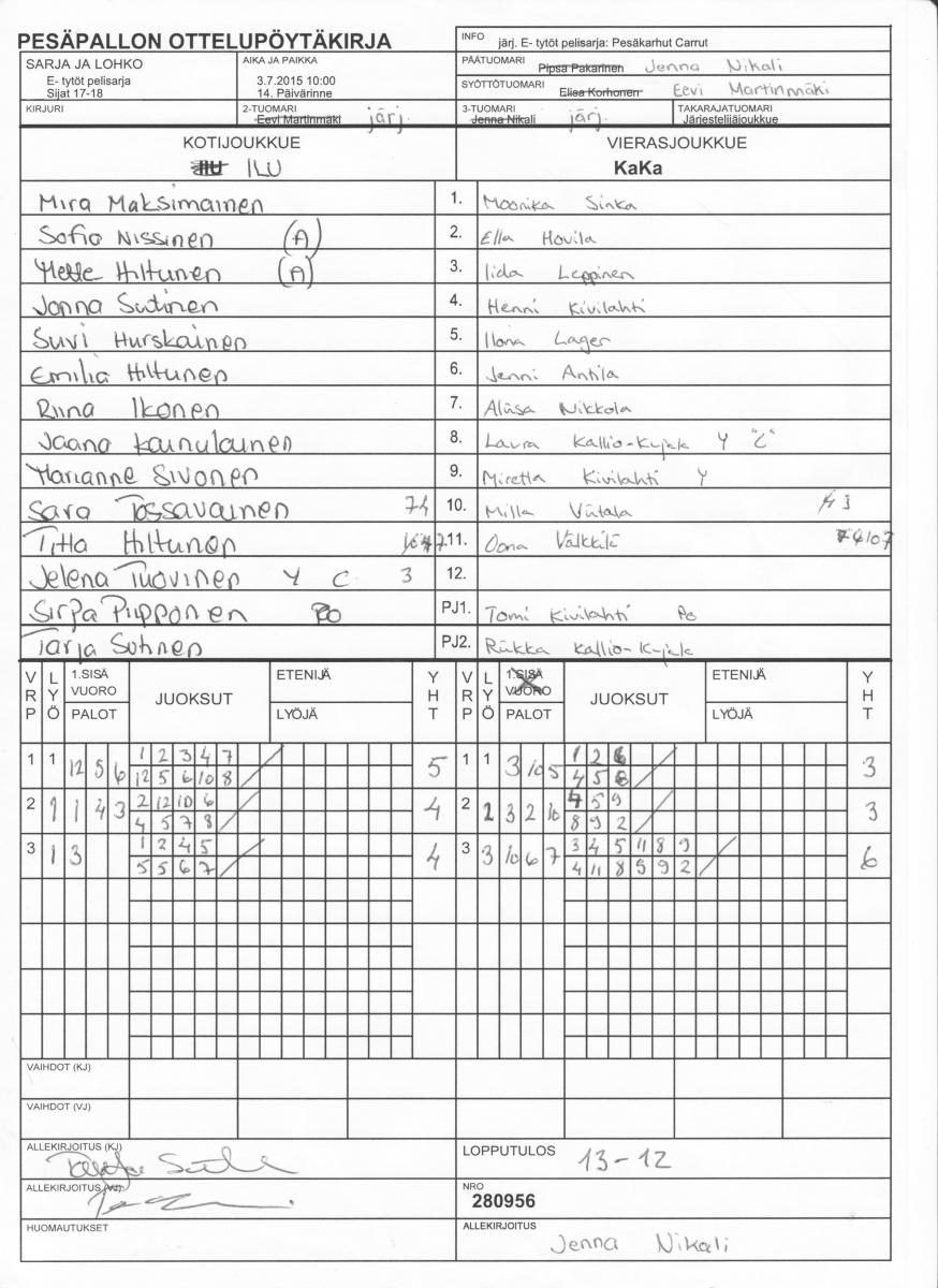 | 280956 | 3.7.2015 10:00 | 14. Päivärinne | IlU | KaKa | 13-12 | E- tytöt pelisarja: Pesäkarhut Carrut | näytä |