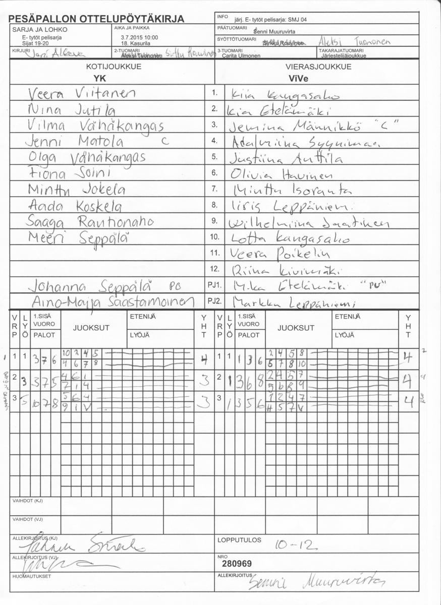 | 280969 | 3.7.2015 10:00 | 18. Kasurila | YK | ViVe | 10-12 | E- tytöt pelisarja: SMJ 04 | näytä |