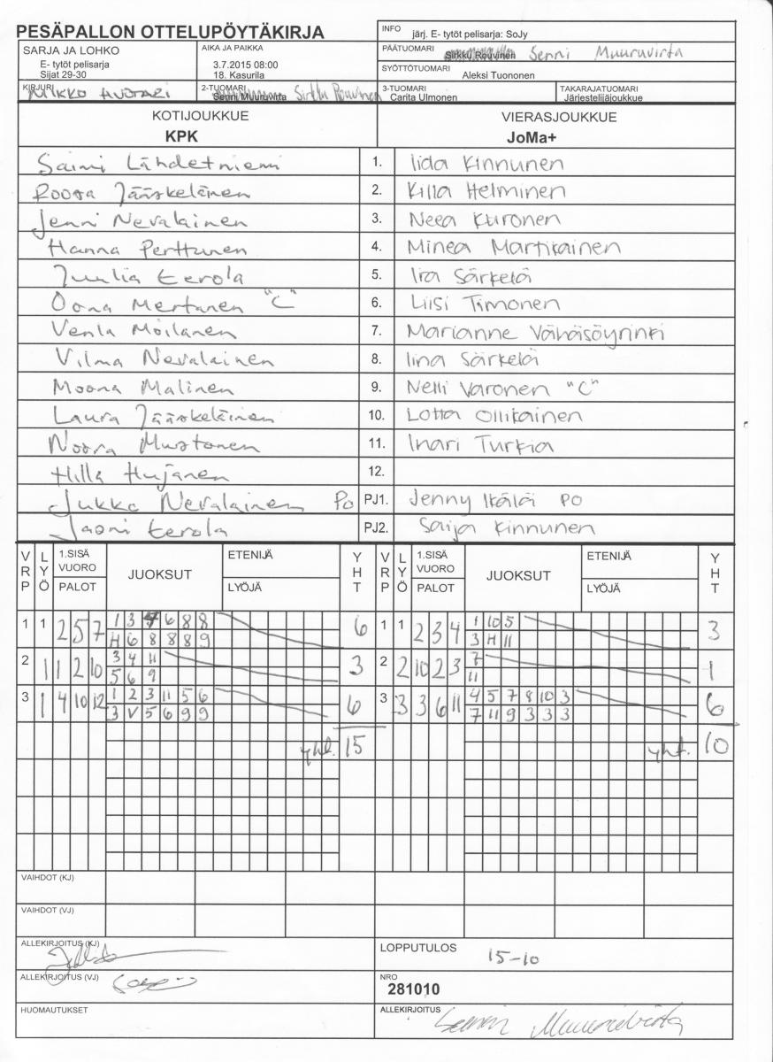 | 281010 | 3.7.2015 08:00 | 18. Kasurila | KPK | JoMa+ | 15-10 | E- tytöt pelisarja: SoJy | näytä |