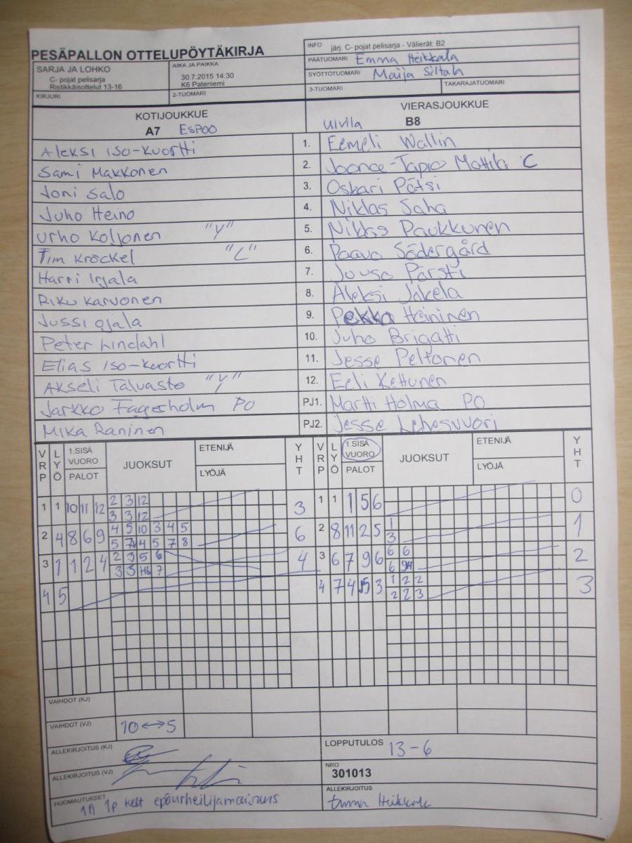 | 301013 | 30.7.2015 14:30 | K6 Pateniemi | Espoo | UPV | 13-6 | C- pojat pelisarja: SiKi | näytä |