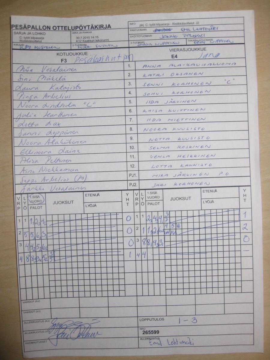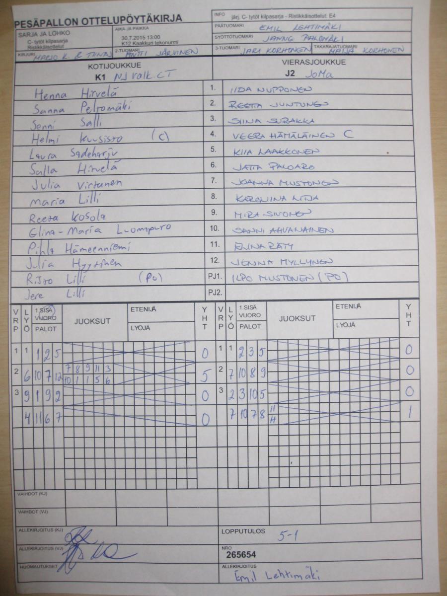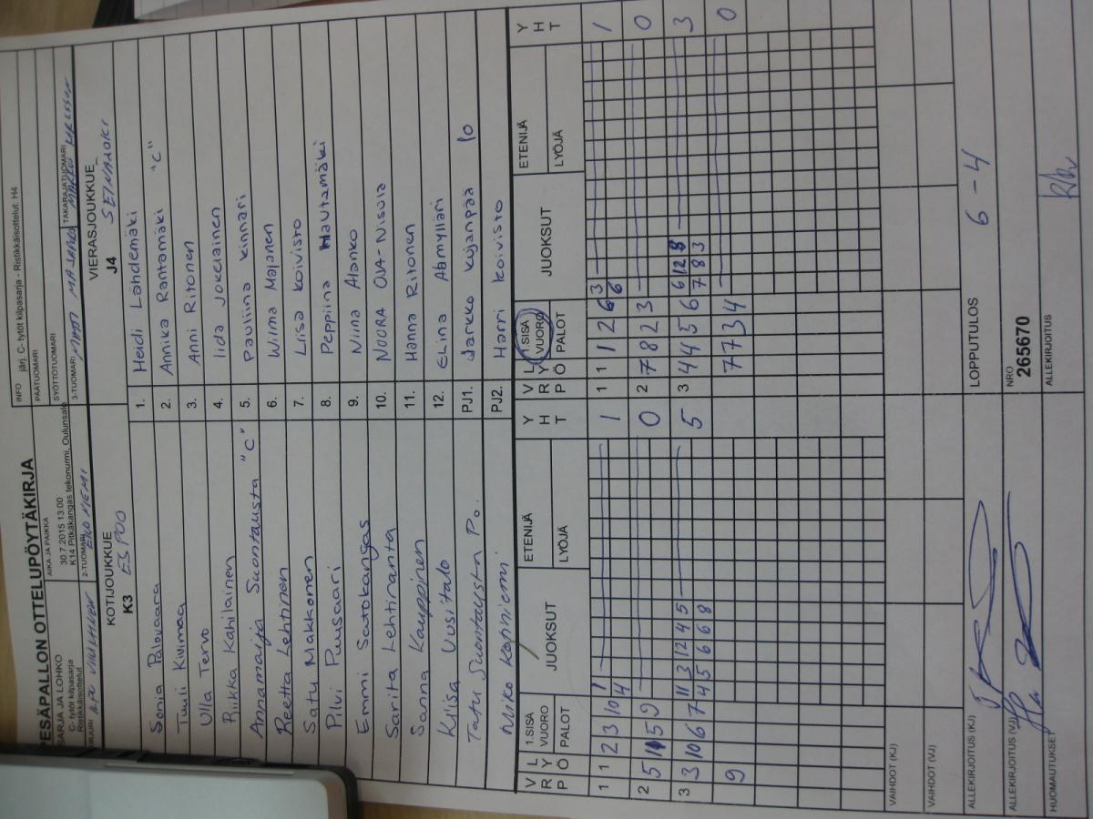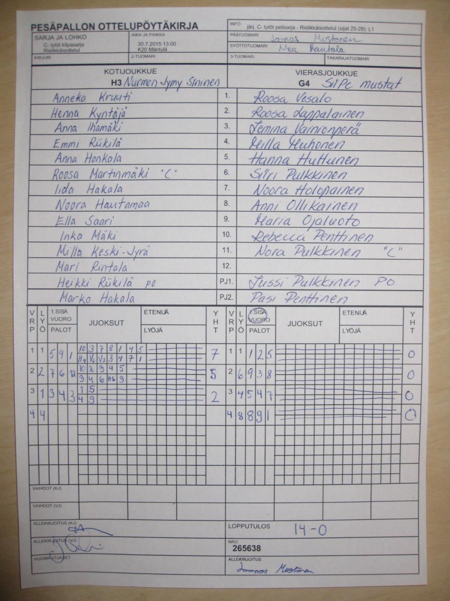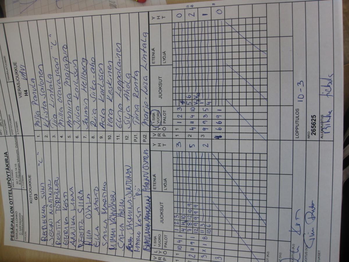 | 265667 | 30.7.2015 13:00 | K13 Lintula | HP | HP-K | 9-6 | C- tytöt kilpasarja: Räpsä C-tytöt | näytä |