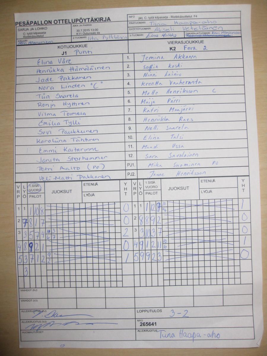 | 265625 | 30.7.2015 14:15 | K14 Pitkäkangas tekonurmi, Oulunsalo | Keki C-00 | VäVi | 10-3 | C- tytöt kilpasarja: SMJ -99 | näytä |