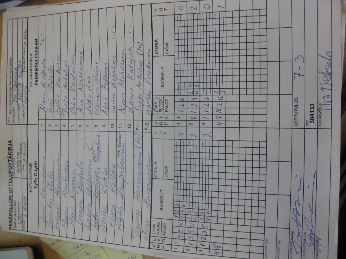 | 304133 | 31.7.2015 11:00 | K12 Kaakkuri tekonurmi | TyTe C-tytöt | Pesäkarhut Punaiset | 7-3 | C- tytöt kilpasarja: Nurmon Jymy Sininen | näytä |