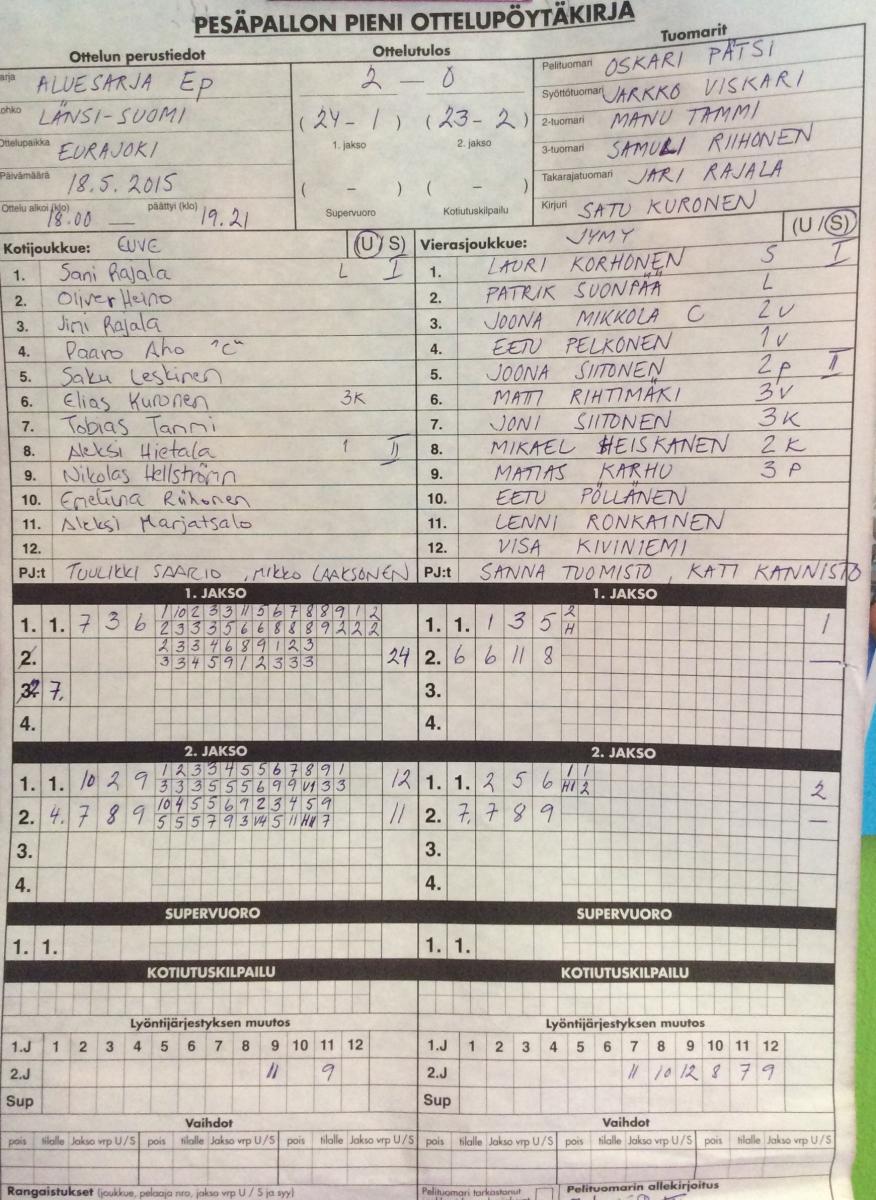 | 231442 | 29.7.2015 18:00 | Jymy E-pojat | EuVe | 0-2 (2-17, 0-11) | |
