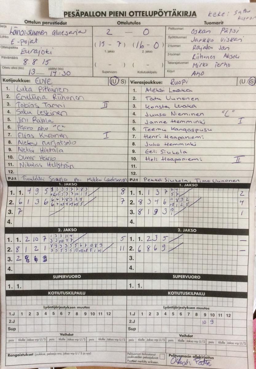 | 231248 | 18.7.2015 12:00 | UP-V E-pojat | RuoPi | 2-0 (18-6, 19-1) | |