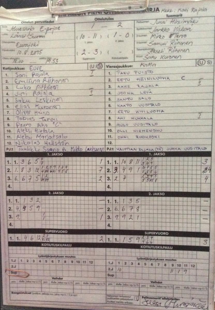 | 231439 | 10.8.2015 18:00 | EuVe | KaMa E-pojat | 1-2 (10-11, 1-0, 2-3) | näytä |