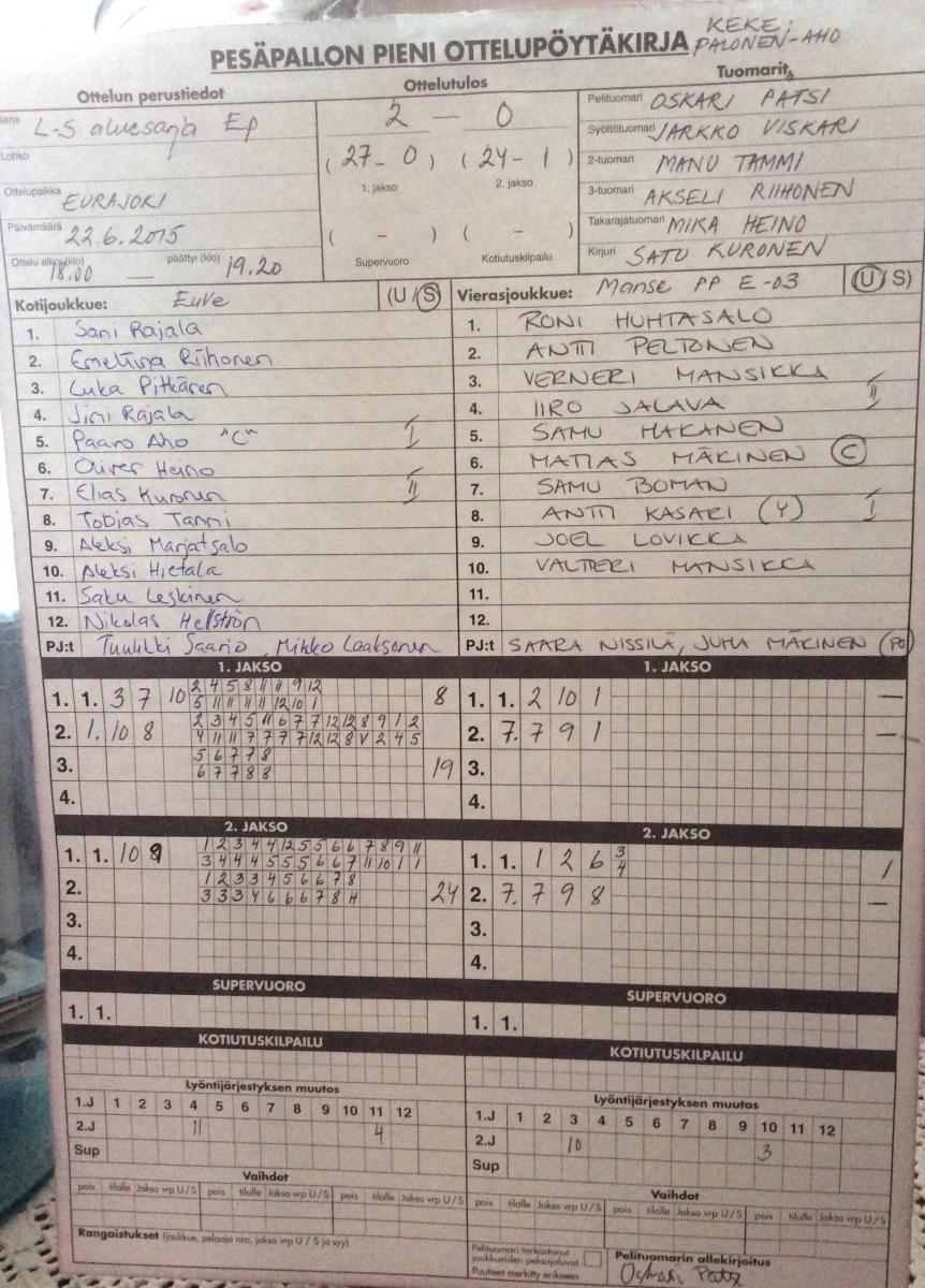 | 233660 | 15.6.2015 18:00 | UP-V E-pojat | Manse PP E-03 | 2-0 (11-3, 10-1) | |