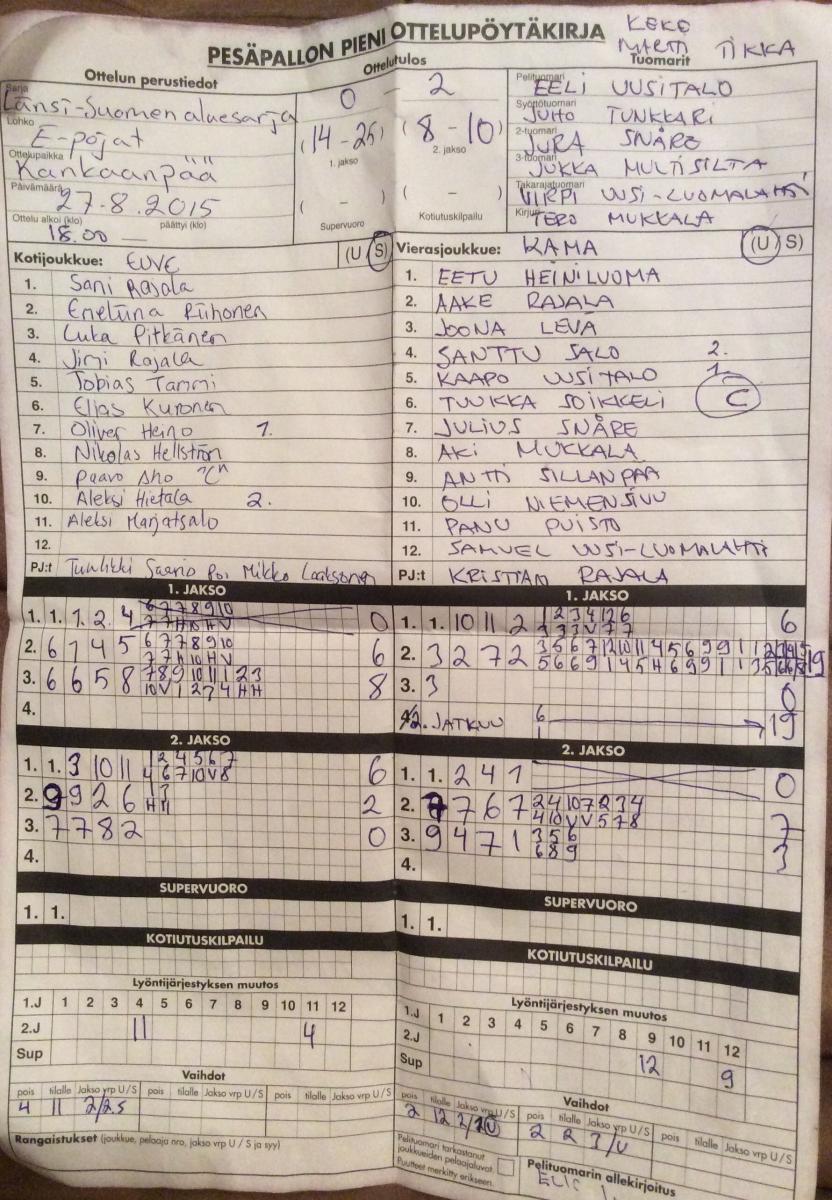 | 308142 | 20.8.2015 18:00 | PomPy | UP-V E-pojat | 2-0 (7-0, 24-1) | |