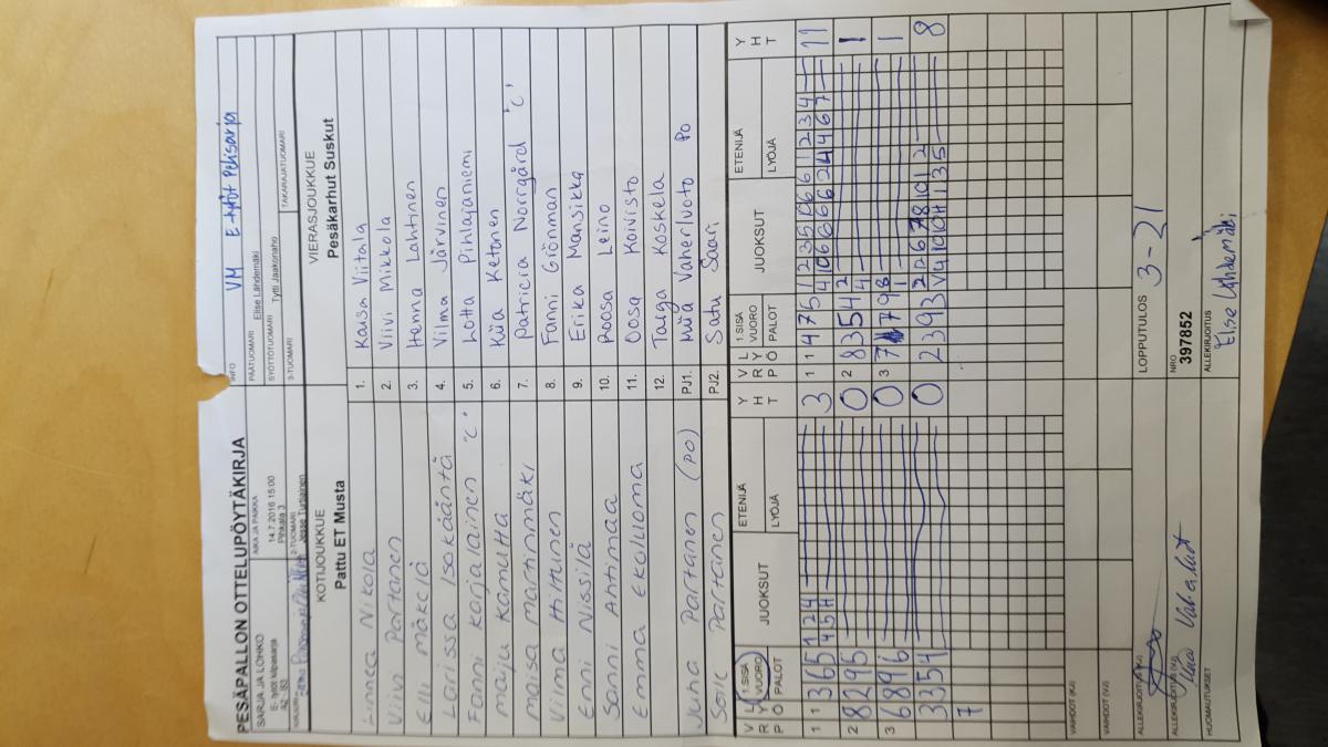 | 397852 | 14.7.2016 15:00 | Pihkala 3 | Pattu ET Musta | Pesäkarhut Suskut | 3-21 | E- tytöt pelisarja: VM | näytä |