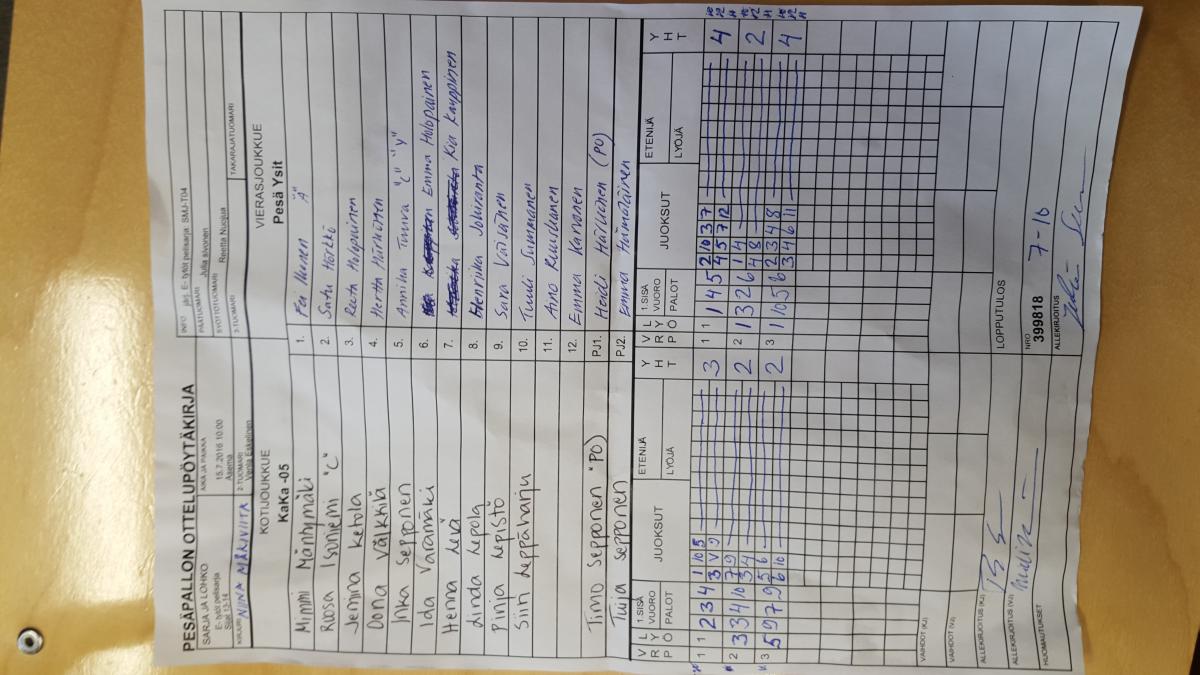 | 399818 | 15.7.2016 10:00 | Asema | KaKa -05 | Pesä Ysit | 7-10 | E- tytöt pelisarja: SMJ-T04 | näytä |