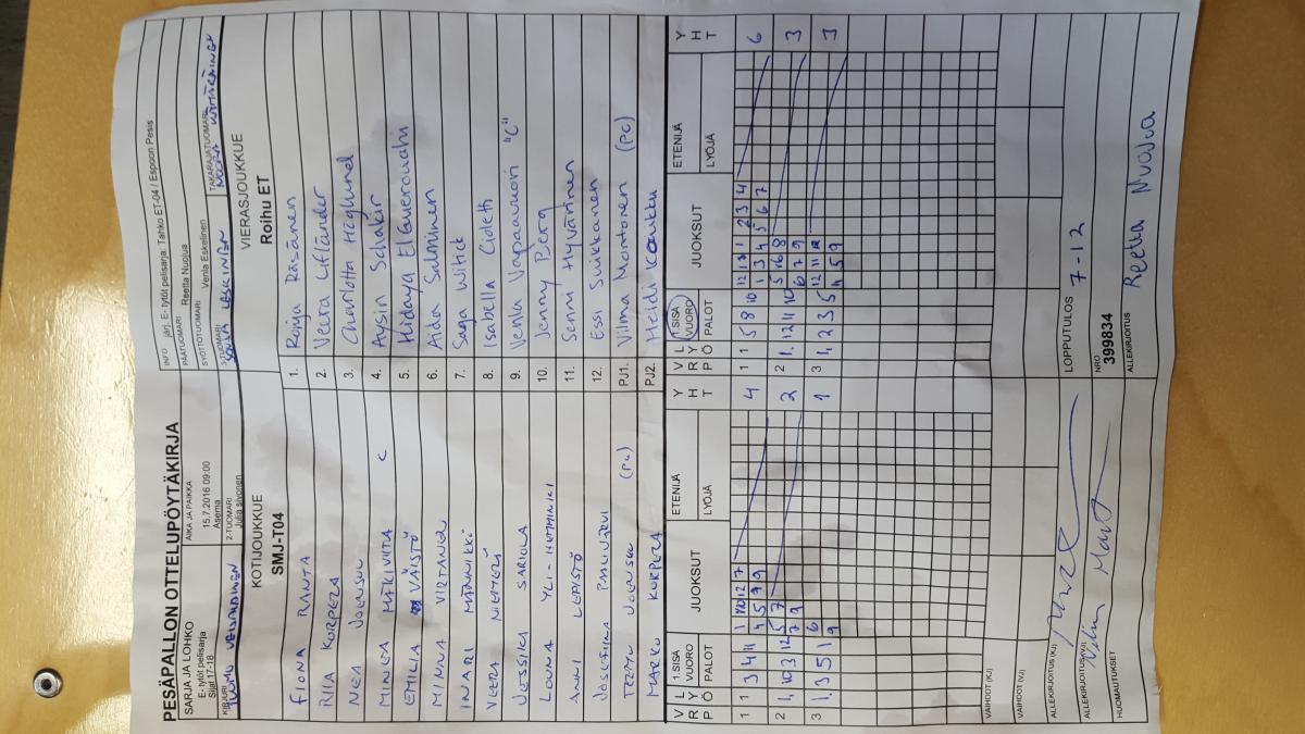 | 399834 | 15.7.2016 09:00 | Asema | SMJ-T04 | Roihu ET | 7-12 | E- tytöt pelisarja: Tahko ET-04 / Espoon Pesis | näytä |