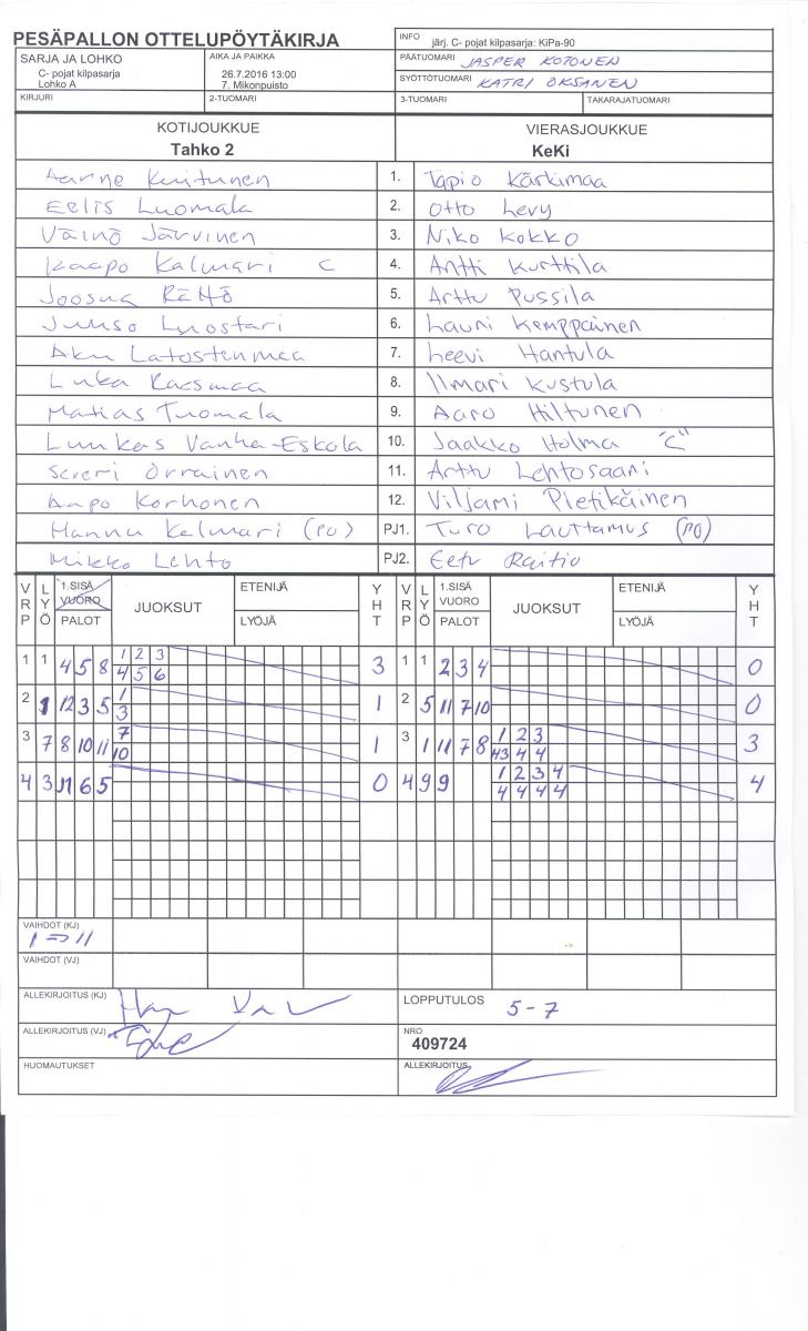 | 409737 | 27.7.2016 19:30 | 18. Kourula (Lappeenranta) | YK | KeKi | 7-8 | C- pojat kilpasarja: SiKi | näytä |