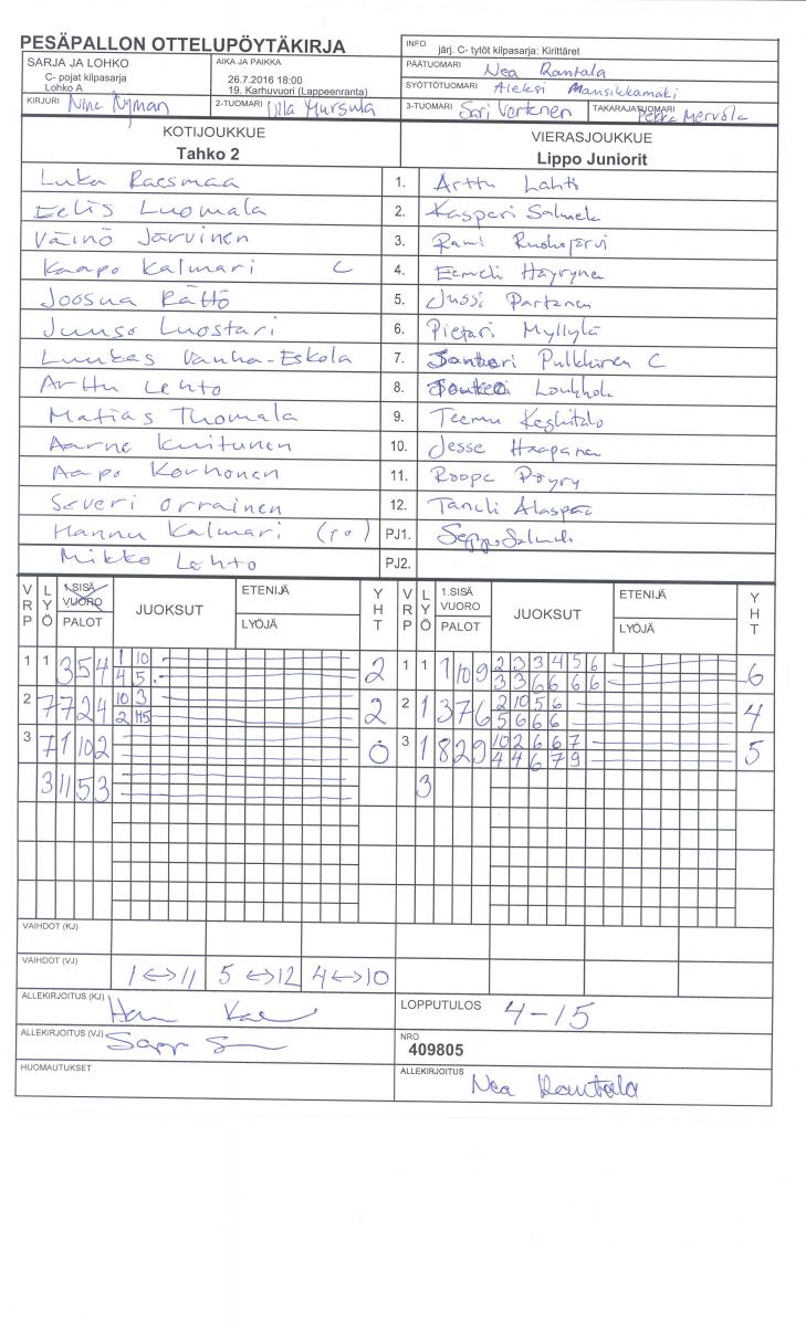 | 409876 | 28.7.2016 10:00 | 5. Immola | YK | Lippo Juniorit | 10-7 | C- pojat kilpasarja: HP | näytä |